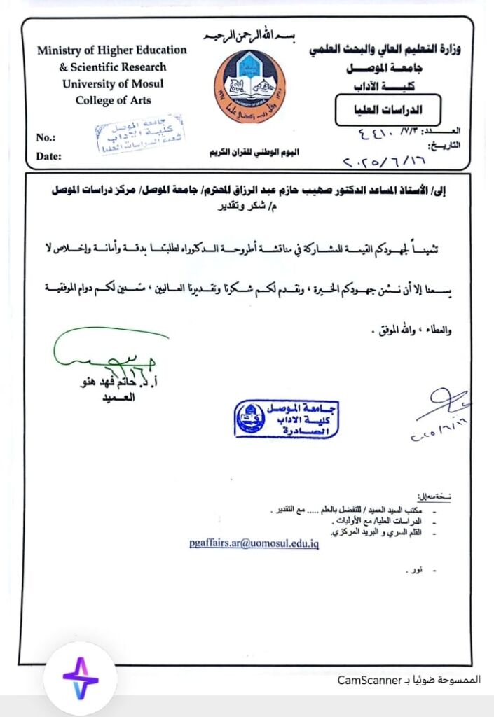 على قاعة السلام/كلية الآداب و قاعة المكتبة في مركز دراسات الموصل وحضر جانب منها السيد عميد كلية الآداب ا.د.حاتم فهد هنو ومدير مركز دراسات الموصل ا.م.د.محمد نزار الدباغ فضلا عن جمع طيب من اساتذة ومنتسبي قسم التاريخ وطلبة الدراسات العليا وأساتذة مركز دراسات الموصل.