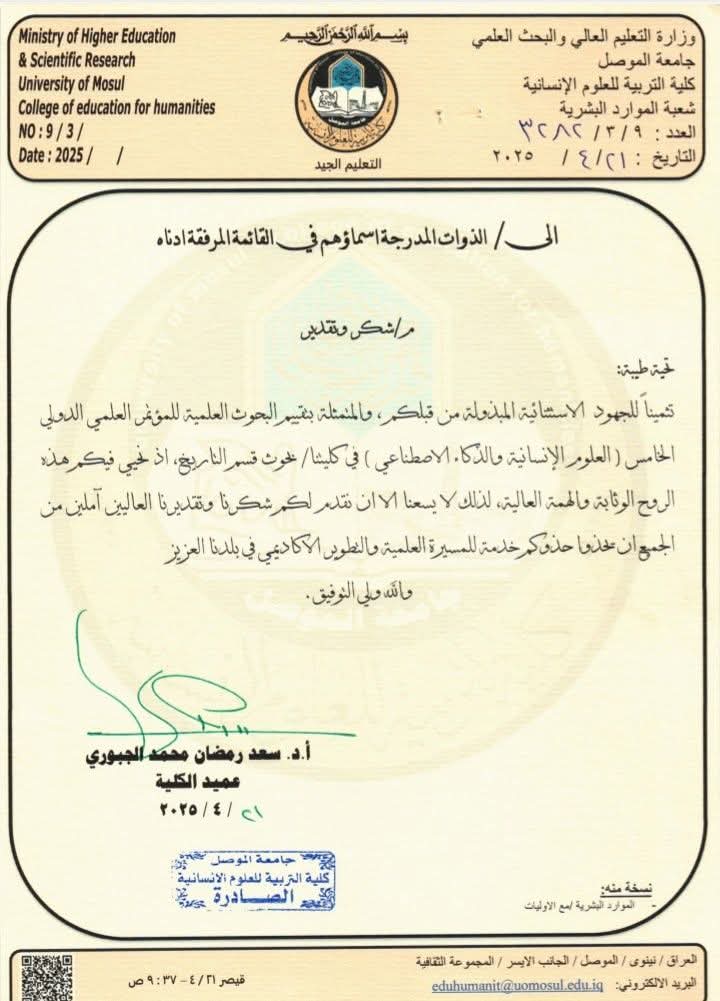 تدريسي من مركز دراسات الموصل يحصل على كتاب شكر وتقدير من عميد كلية التربية للعلوم الانسانية