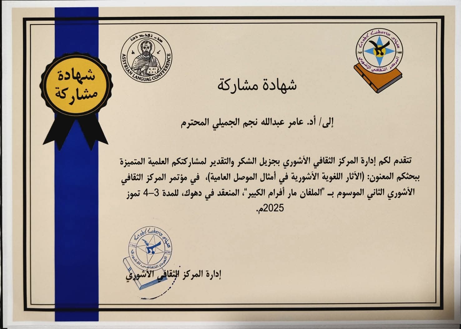 mohammadmoslem2025-07-04T23:48:47+03:00شهادة مشاركة ................ حصل أ.د.عامر عبدالله الجميلي التدريسي في مركز دراسات الموصل على شهادة مشاركة من المركز الثقافي الاشوري بدهوك لمشاركته في المؤتمر العلمي الثاني للمركز والمتعلق باللغة الاشورية . للمزيد: https://uomosul.edu.iq/mosulstudiescenter/?p=39505&preview=true #جامعة_الموصل #مركز_دراسات_الموصل