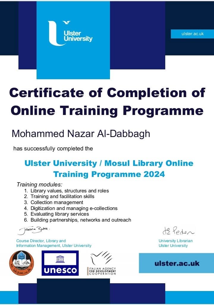 mohammadmoslem2025-07-04T10:34:33+03:00مدير مركز دراسات الموصل يحصل على شهادة مشاركة دولية ....... حصل مدير مركز دراسات الموصل ا.م.د.محمد نزار الدباغ على شهادة إتمام برنامج تدريبي عبر الإنترنت بعد اكمال البرنامج بنجاح والخاص بالتدريب عبر الإنترنت لمكتبة جامعة أولستر- المملكة المتحدة /الموصل 2024 والذي اشتمل على ستة وحدات تدريبية استمرت لشهرين وهي : 1. قيم المكتبة وهياكلها وأدوارها 2. مهارات التدريب والتيسير 3. إدارة المجموعات 4. رقمنة وإدارة المجموعات الإلكترونية 5. تقييم خدمات المكتبة 6. بناء الشراكات والشبكات والتواصل. ممثلا عن مكتبة مركز دراسات الموصل رفقة بعض موظفي المكتبة المركزية - جامعة الموصل وهذا البرنامج التدريبي يشكل جزءا من مشروع استعادة المكتبة المركزية الذي [إقرأ المزيد]