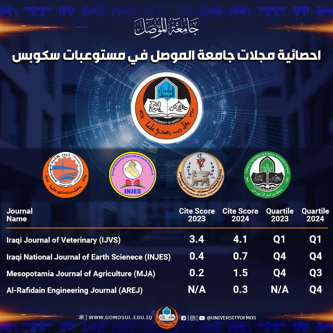 ويُذكر أن جامعة الموصل لديها أربع مجلات علمية مصنّفة ضمن مستوعبات Scopus، وهي المجلة العراقية للعلوم البيطرية ، مجلة العلوم الزراعية والغابات ، المجلة العراقية لعلوم الأرض ، ومجلة هندسة الرافدين.