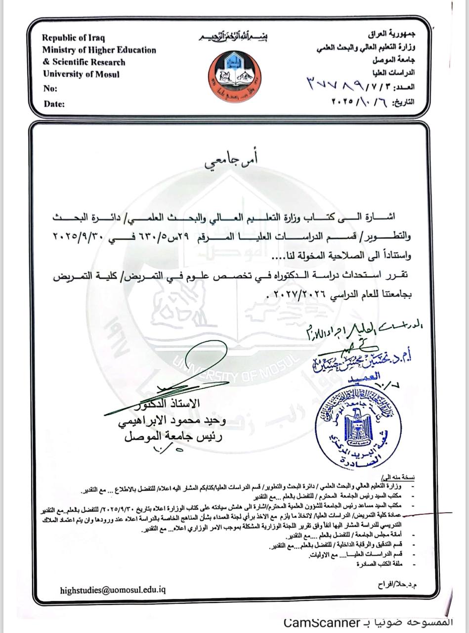 استحداث دراسة الدكتوراه في تخصص التمريض بجامعة الموصل: إنجاز علمي يعزز ريادة الكلية ومسيرتها البحثية