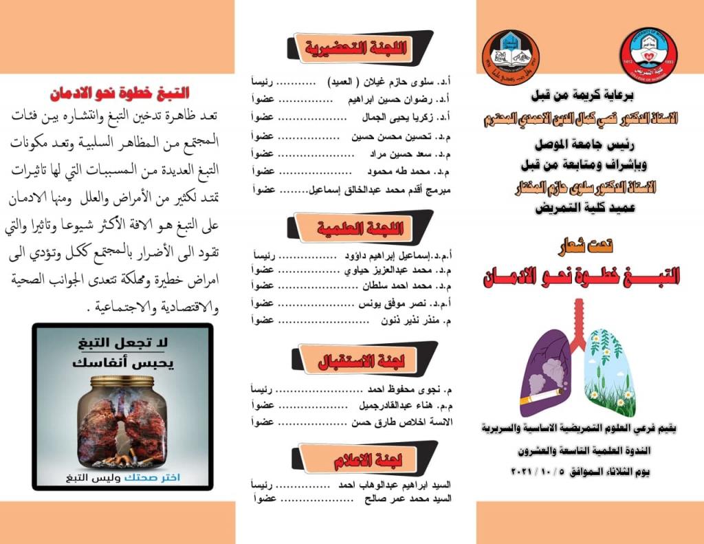 برعاية كريمة من السيد رئيس جامعة الموصل الاستاذ الدكتور قصي كمال الدين الاحمدي المحترم ، وبإشراف ومتابعة السيدة عميد كلية التمريض الاستاذ الدكتورة سلوى حازم المختار المحترمة ، يقيم فرعي العلوم التمريضية الاساسية والسريرية الندوة العلمية التاسعة والعشرون تحت عنوان ( التبغ خطوة نحو الادمان )