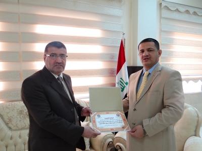 كرم الأستاذ المساعد الدكتور رضوان حسين إبراهيم عميد كلية التمريض المهندس سعد شاكر محمود بشهادة تقديرية،وأهدى السيد العميد درع الكلية إلى قسم شؤون محافظة نينوى التابع لوزارة العلوم والتكنولوجيا دائرة شؤون المحافظات غير المنتظمة في أقليم لتعاونه العلمي مع الكلية، كما وأهدى درع الكلية للمهندس سعد تثميناً لجهوده المبذولة في تصميم العديد من البرنامج الإدارية والتي من شأنها الارتقاء بالواقع الإداري في الكلية.