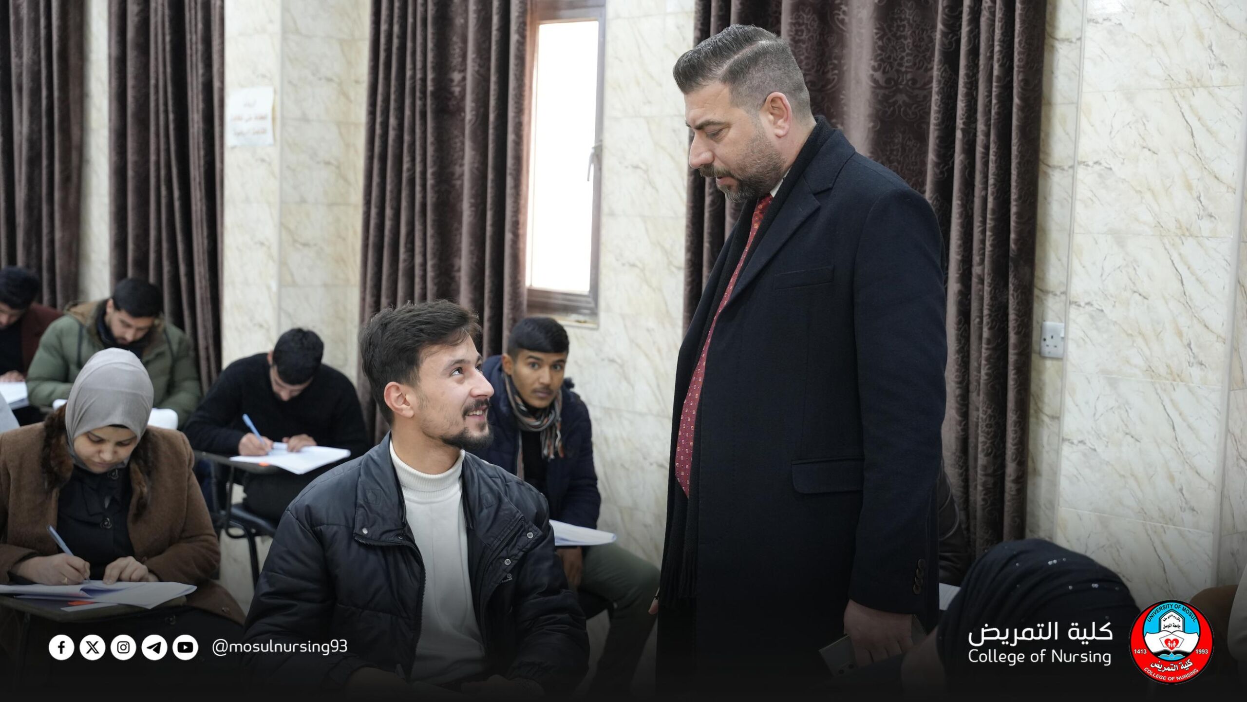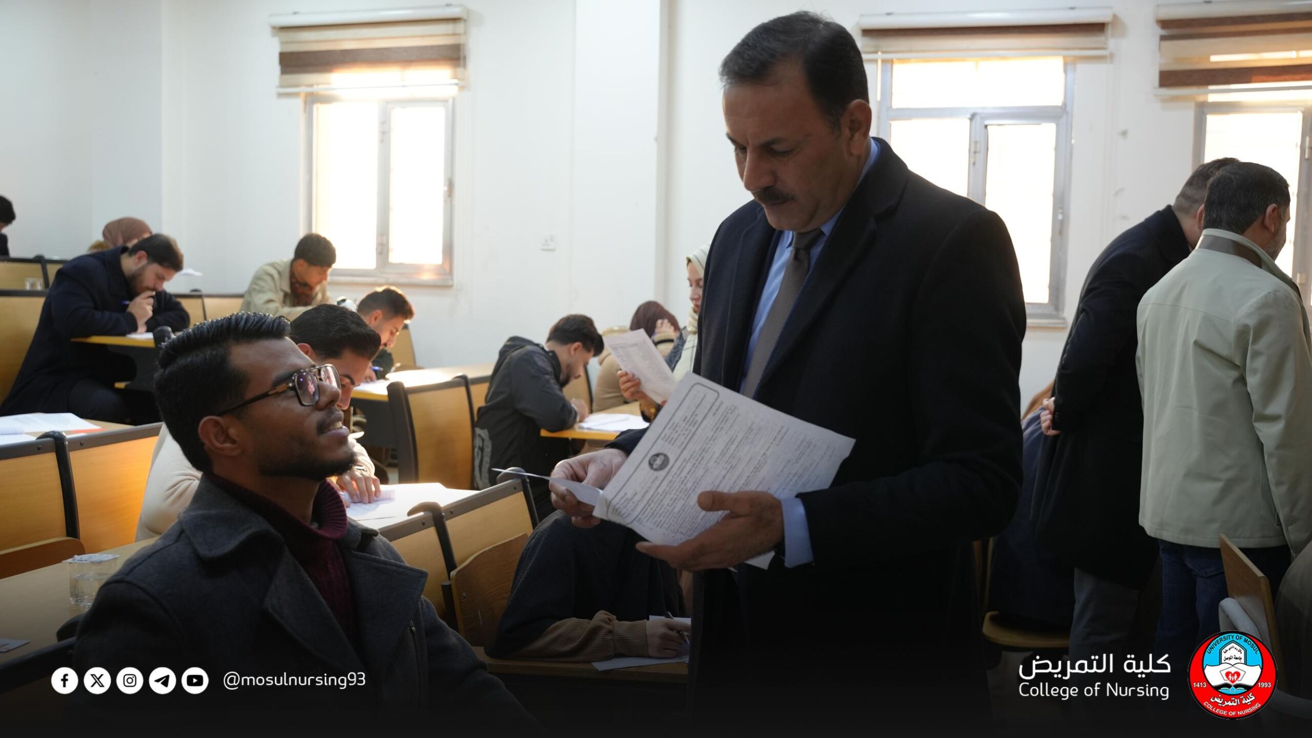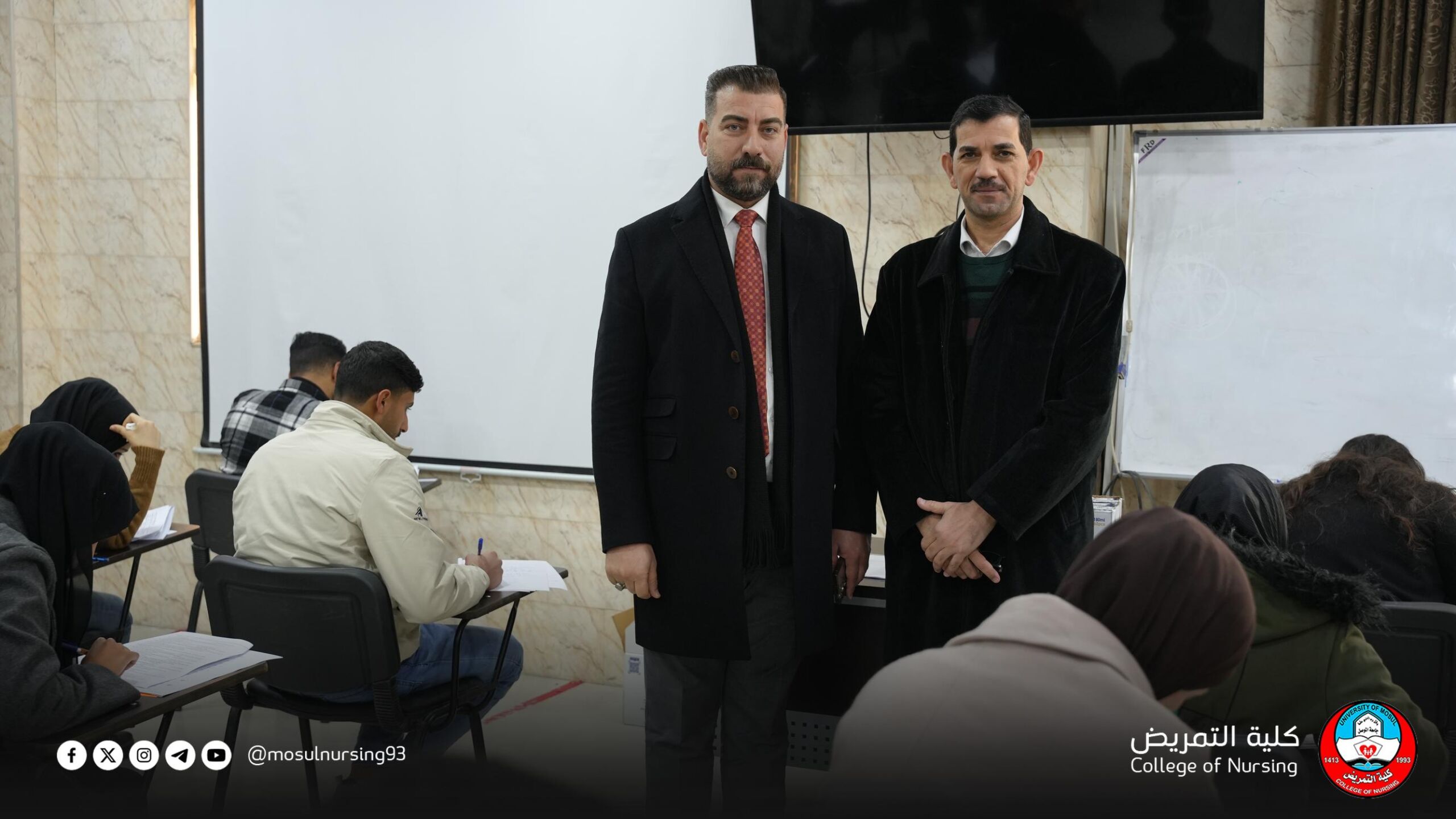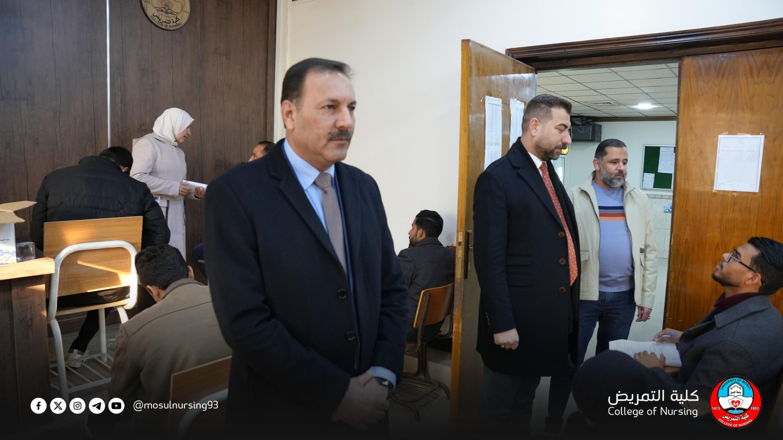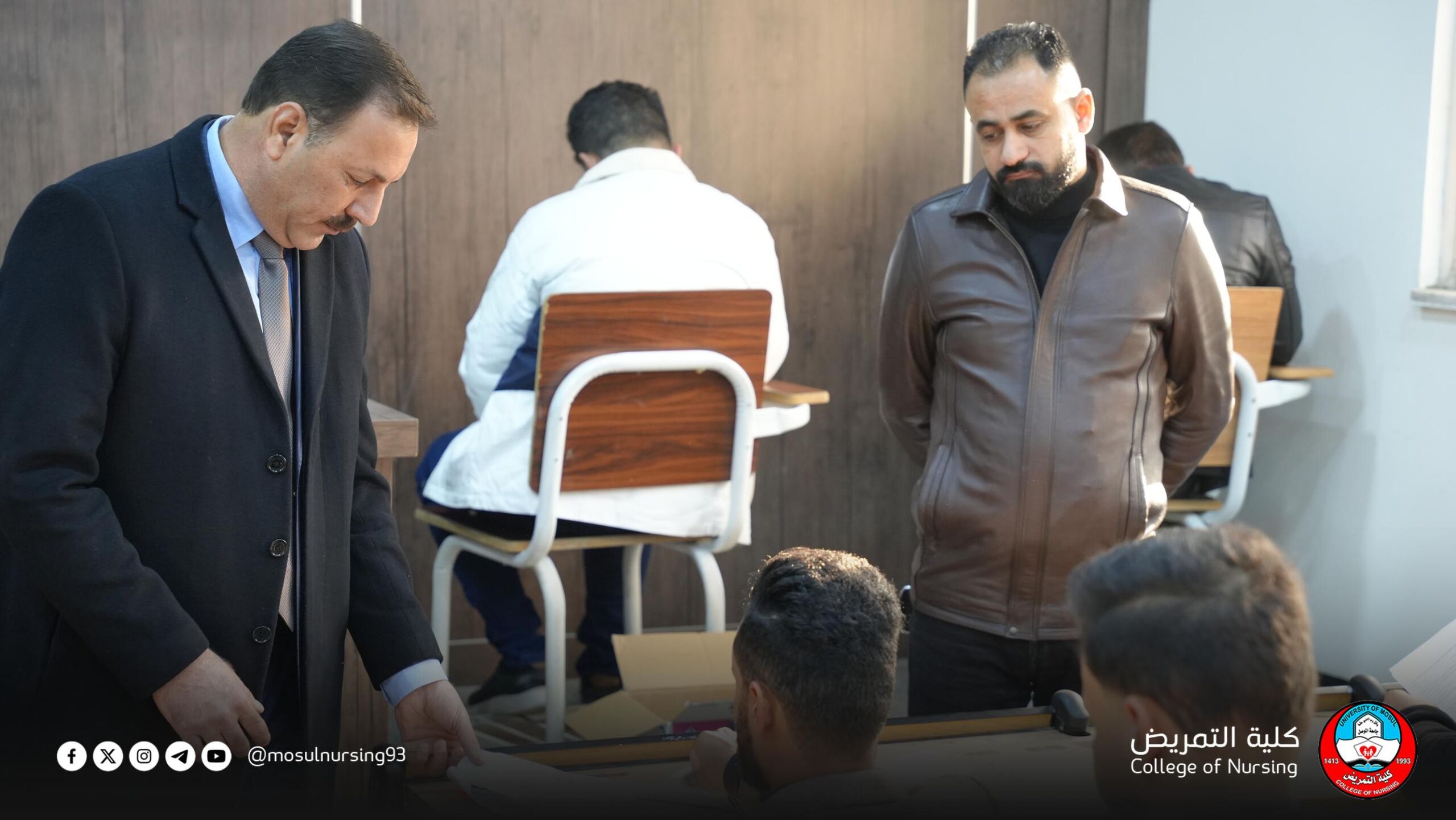 السيد عميد كلية التمريض الدكتور تحسين محسن حسين يجري جولة تفقدية للقاعات الامتحانية في الكلية، برفقة السيد معاون العميد للشؤون الإدارية والمالية الدكتور ريان إبراهيم خليل، والسيدة معاون العميد للشؤون العلمية وطلبة الدراسات العليا الدكتورة هناء حسين مخلف.