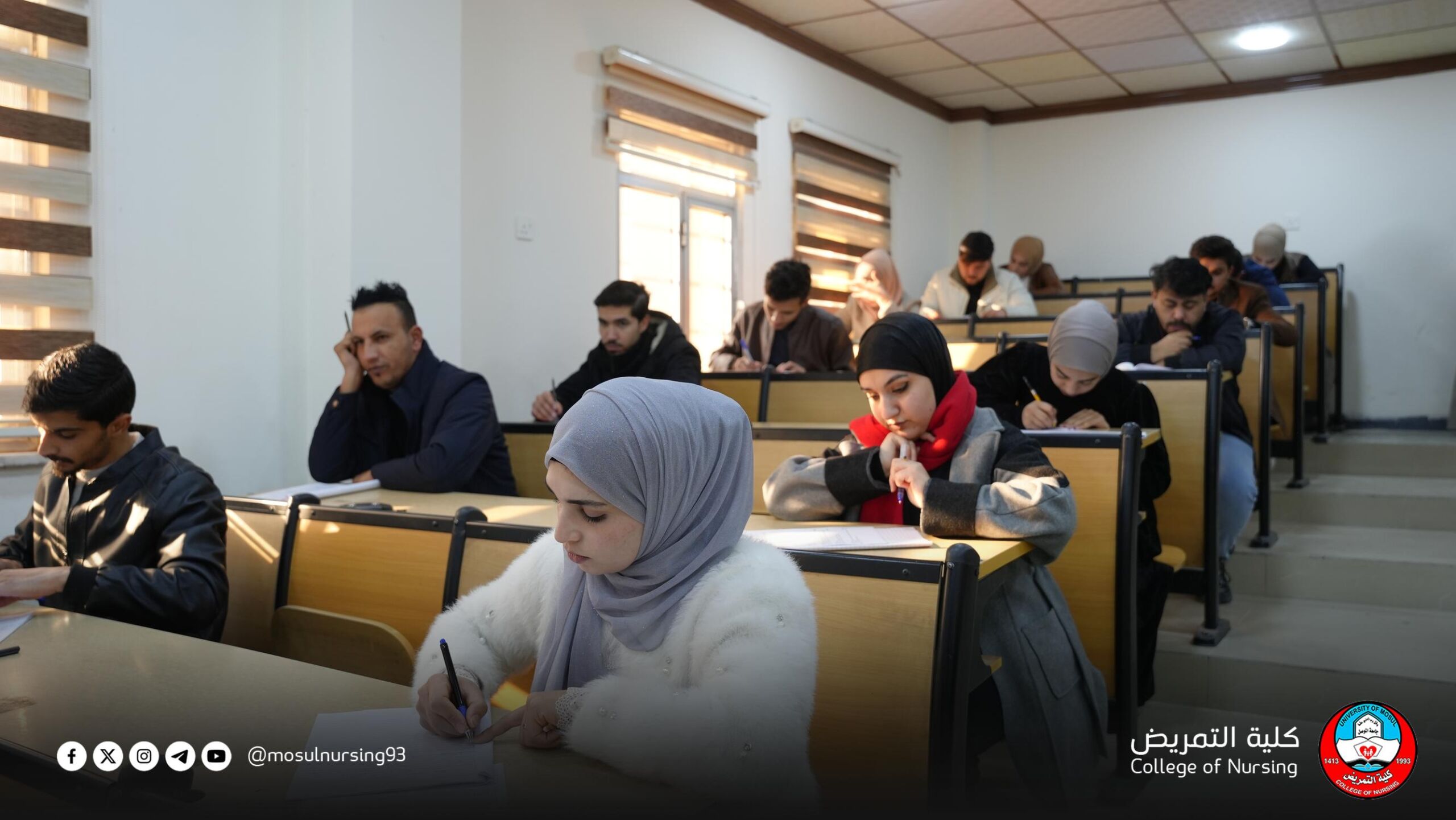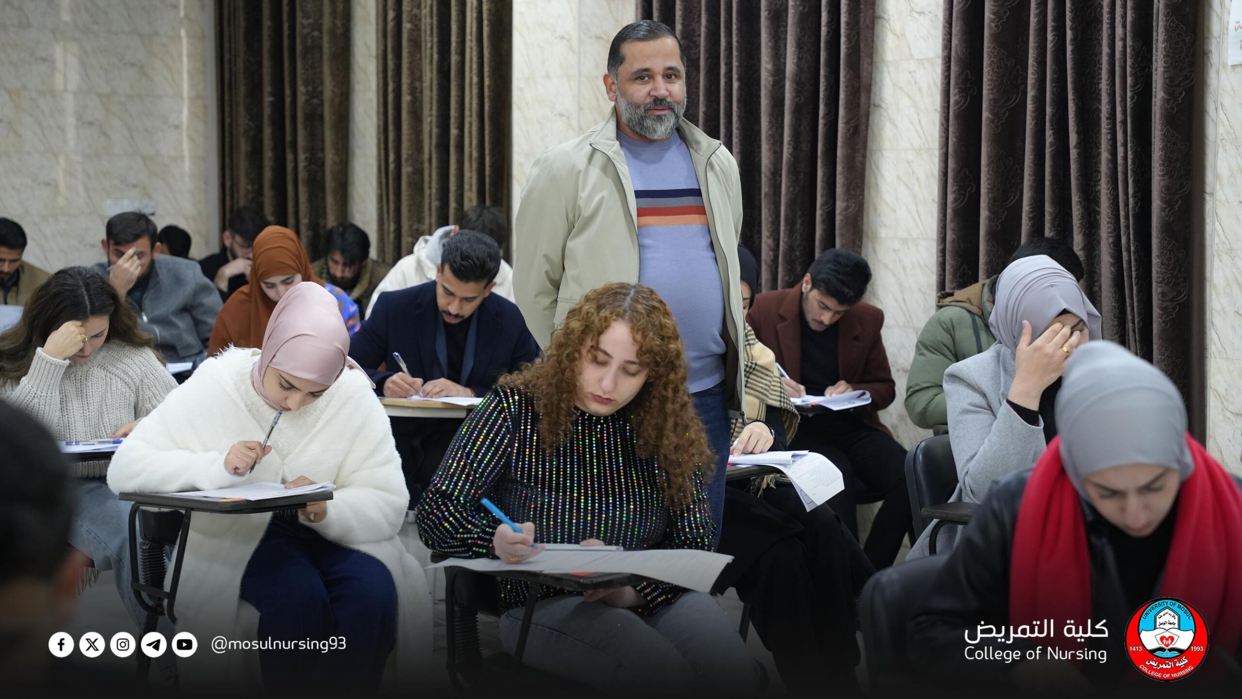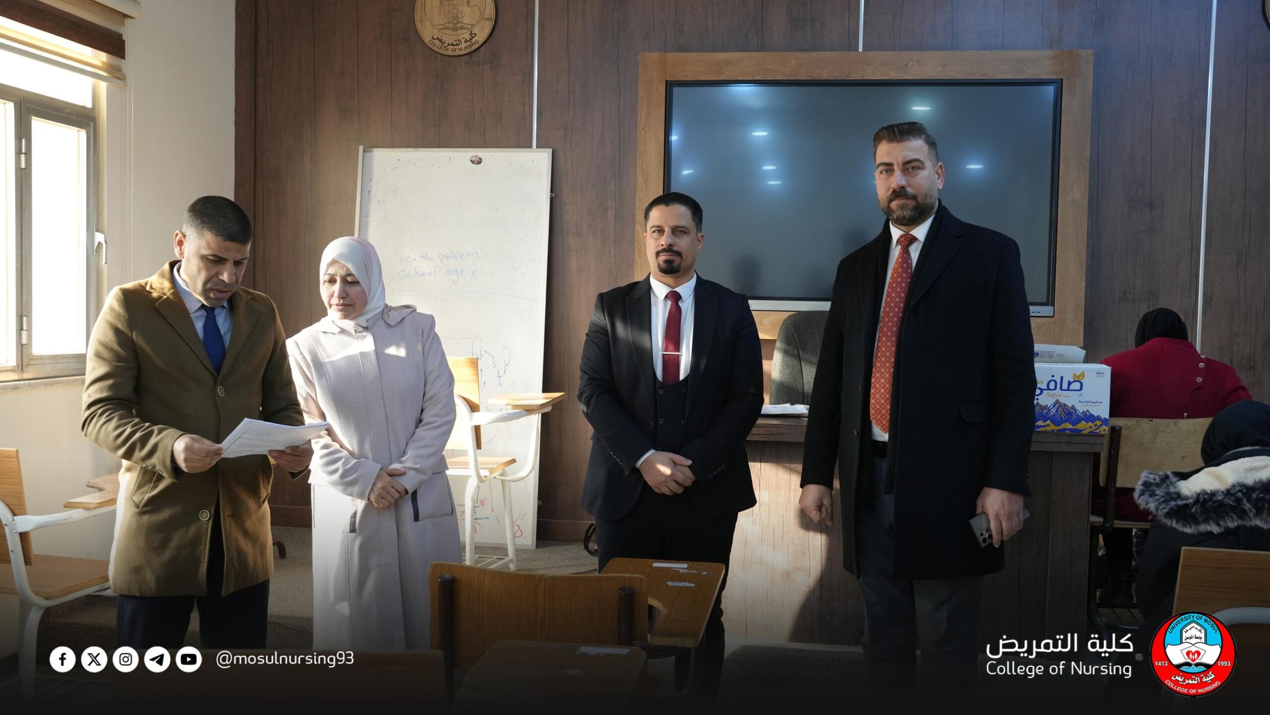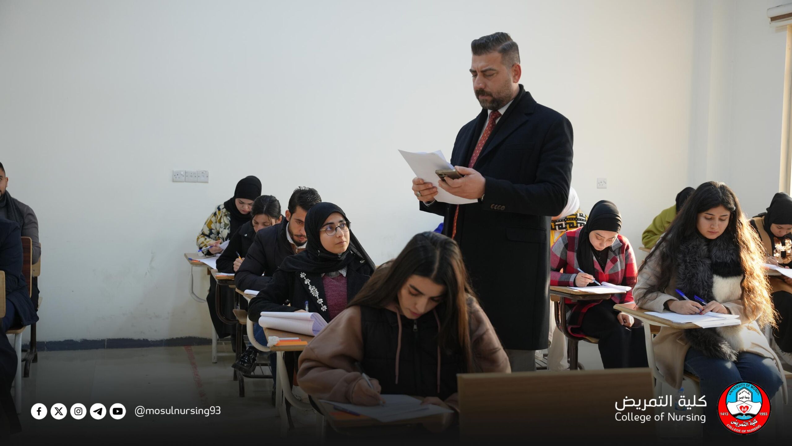 السيد عميد كلية التمريض الدكتور تحسين محسن حسين يجري جولة تفقدية للقاعات الامتحانية في الكلية، برفقة السيد معاون العميد للشؤون الإدارية والمالية الدكتور ريان إبراهيم خليل، والسيدة معاون العميد للشؤون العلمية وطلبة الدراسات العليا الدكتورة هناء حسين مخلف.