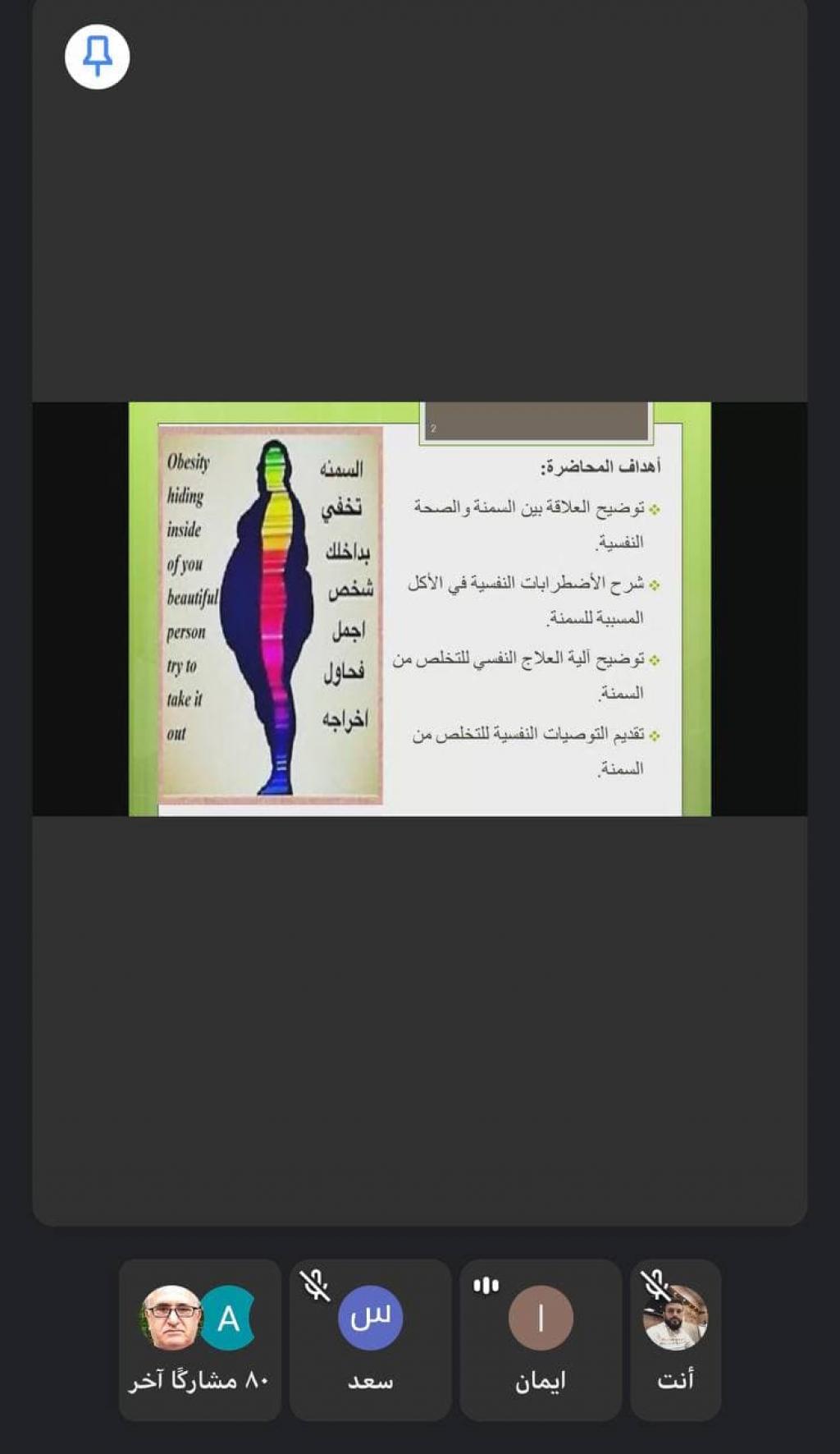 بحثت جلسات الدورة خلال يومها الثاني ، توازن الطاقة الغذائية للاستاذ الدكتور عبدالله محمد ذنون التدريسي في كلية الزراعة والغابات ،تلاها محاضرة للمدرس ايمان سالم والتي كانت بعنوان العلاقة بين السمنة والصحة النفسية .