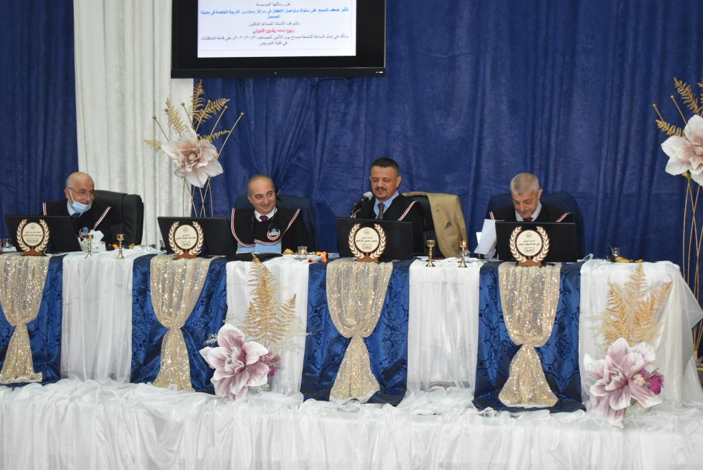 بحضور الأستاذ الدكتور منير سالم طه مساعد رئيس جامعة الموصل للشؤون العلمية والاستاذ الدكتور سلوى حازم المختار عميدة كلية التمريض ناقشت كلية التمريض في جامعة الموصل رسالة الماجستير الموسومة ( تأثير ضعف السمع على سلوك وتواصل الاطفال في مدارس ومراكز التربية الخاصة في مدينة الموصل )، والتي تقدمت بها الطالبة هناء عبدالقادر جميل السعيد صباح اليوم الاربعاء الموافق 7 تشرين الاول 2020 ، أظهرت النتائج تنامي سلوك عدواني لدى الأطفال ضعاف السمع حسب شدة السمع وكذلك مشاكل تواصلية مع الأقران والبيئة المحيطة فضلاً على وجود مشاكل وتحديات تواجه المعلمين في هذا المجال في البيئة العراقية توصي الدراسة بضرورة الإهتمام بهذه الشريحة من الأطفال وإعطائهم دورا في ممارسة الحياة الطبيعية ودمجهم مع الأصحاء لاكتساب مهارات وسلوكيات صحية غير انعزالية.كما توصي بعمل برامج ودورات تدريبية لمعلمات ضعاف السمع للتعامل مع الأطفال بصورة صحيحة .ترأس لجنة المناقشة الاستاذ الدكتور رضوان حسين ابراهيم وعضوية كل من الأستاذ الدكتور على عبد المطلب محمد و الاستشاري معتز عبدالجواد العاني الأستاذ المساعد الدكتور ربيع محمد ياسين الدبوني عضوا ومشرفا