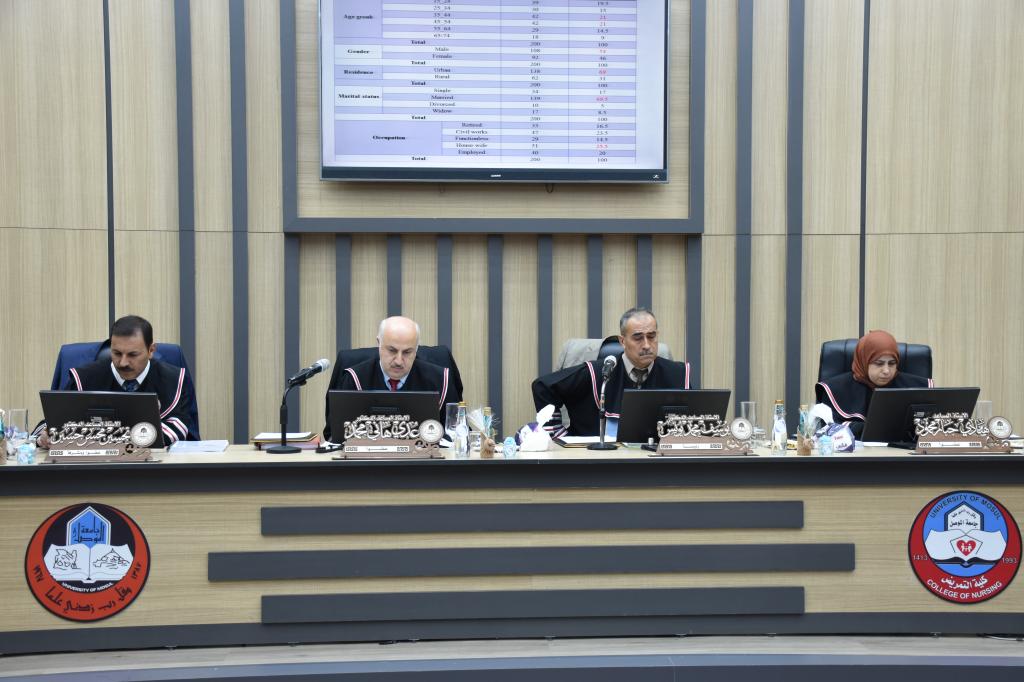 بحضور الاستاذ الدكتورة سلوى حازم المختار عميد كلية التمريض بجامعة الموصل والاستاذ الدكتور رضوان حسين ابراهيم عميد كلية التمريض بجامعة نينوى والمدرس الدكتور سعد حسين مراد معاون العميد للشؤون العلمية لكلية التمريض بجامعة الموصل وكذلك عدد من تدريسيي الكلية وطلبة الدراسات العليا.