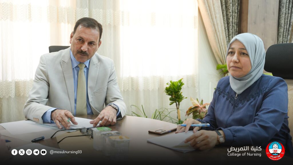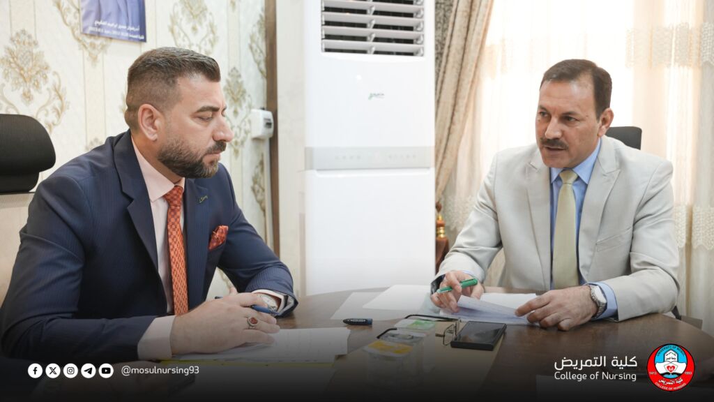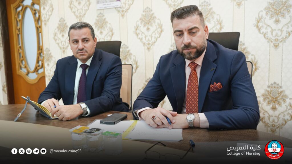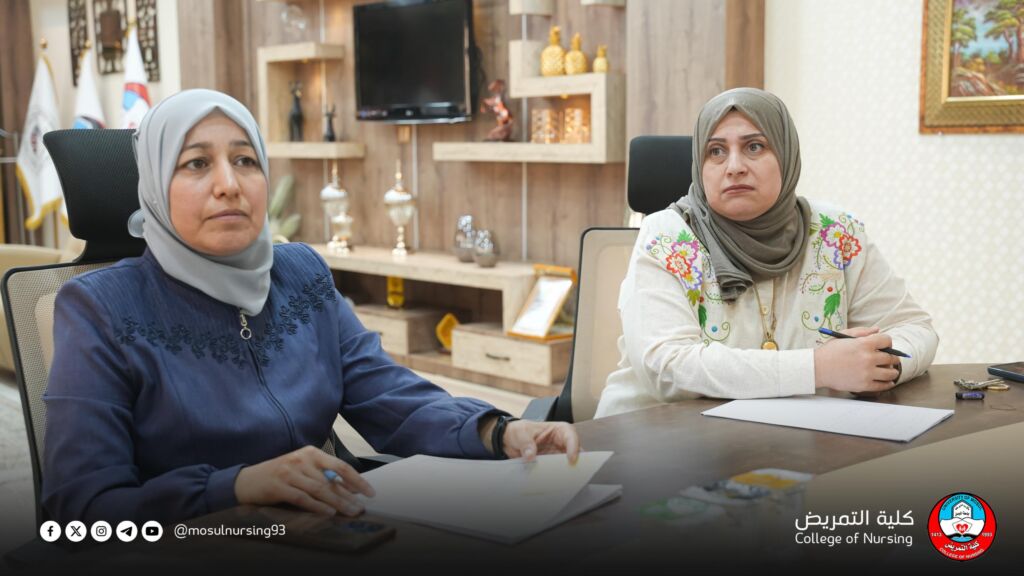عقد السيد عميد كلية التمريض الأستاذ المساعد الدكتور تحسين محسن حسين اجتماعاً مع السادة أعضاء مجلس كلية التمريض،الاستاذ المساعد الدكتورة هناء حسين مخلف معاون العميد للشؤون العلمية والمدرس الدكتور ريان ابراهيم خليل معاون العميد للشؤون الادارية والمالية والاستاذ المساعد الدكتور محمود محمد احمد رئيس فرع العلوم التمريضية السريرية والمدرس الدكتورة فرح محمد غزال رئيس فرع العلوم التمريضية الاساسية