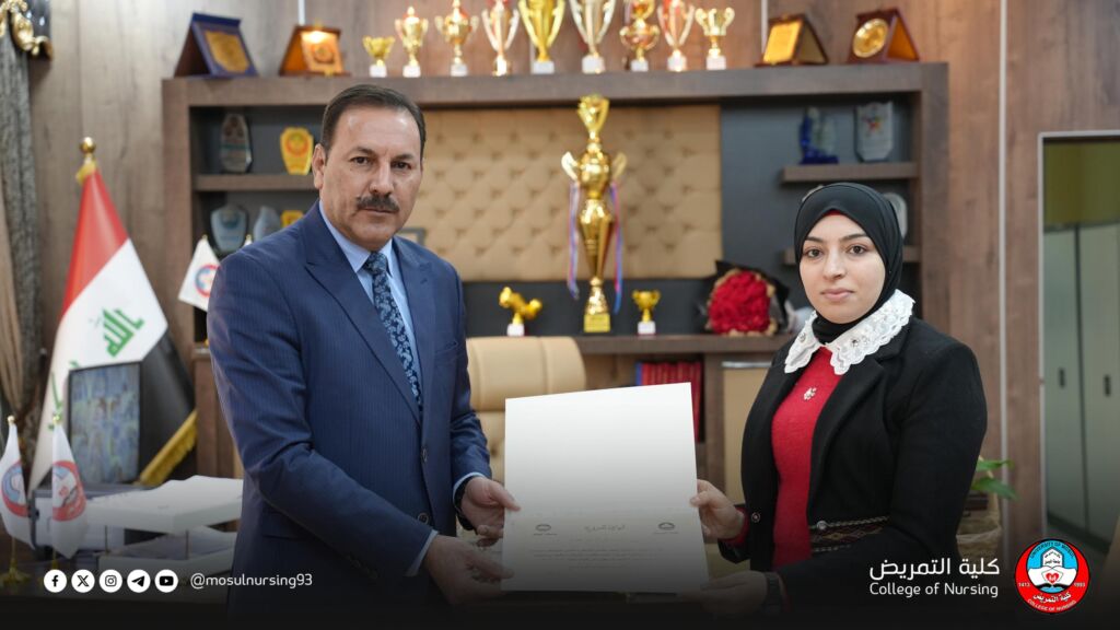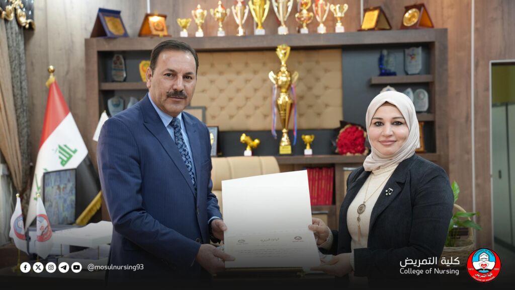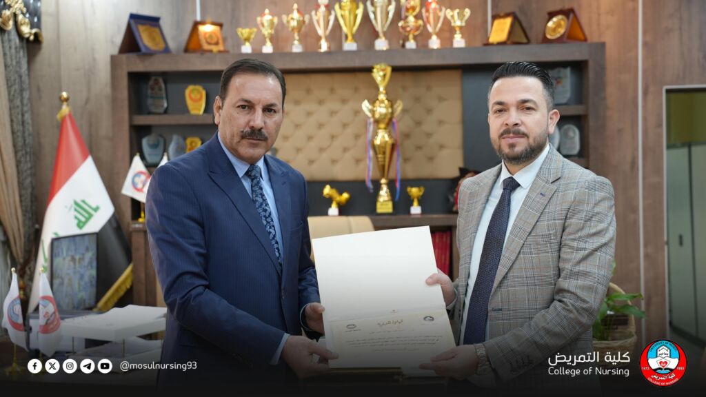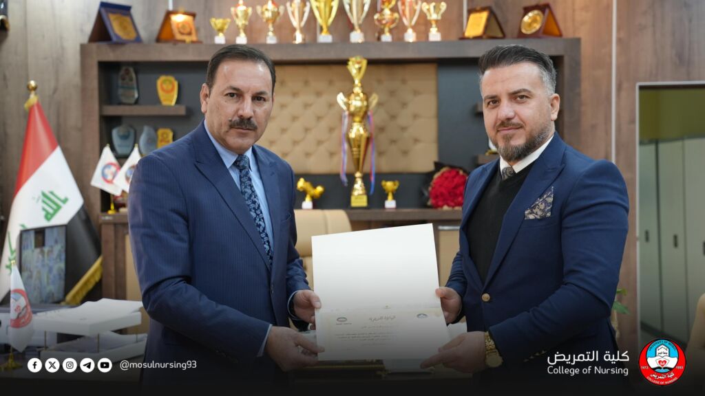 عميد كلية التمريض يكرّم لجنة دائرة صحة نينوى تقديراً لجهودها في مناقشة مخرجات التعليم ومتطلبات المؤسسات الصحية ضمن الاعتماد البرامجي