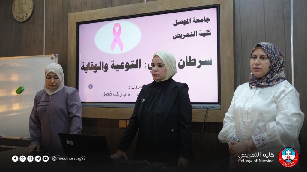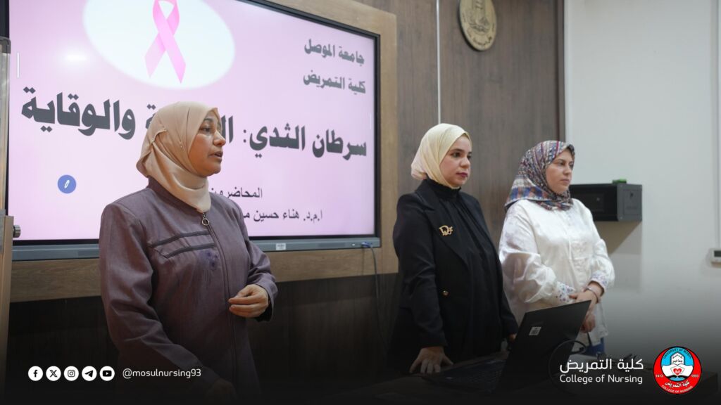برعاية وإشراف السيد عميد كلية التمريض الأستاذ المساعد الدكتور تحسين محسن حسين، وبمتابعة السيدة مسؤولة وحدة تمكين المرأة المدرس المساعد زينب فيصل، أقامت كلية التمريض محاضرة توعوية بعنوان “التوعية بسرطان الثدي”، قدّمتها السيدة معاون العميد للشؤون العلمية والطلبة والدراسات العليا الأستاذ المساعد الدكتورة هناء حسين مخلف.