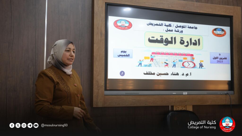 برعاية السيد عميد كلية التمريض الأستاذ المساعد الدكتور تحسين محسن حسين، و بإشراف السيد مسؤول وحدة التأهيل والتوظيف والمتابعة في الكلية المدرس الدكتور محمد سلطان، نظّمت كلية التمريض ورشة عمل بعنوان “إدارة الوقت: التخطيط والأولويات”، قدّمتها السيدة معاون العميد للشؤون العلمية والطلبة والدراسات العليا الأستاذ المساعد الدكتورة هناء حسين مخلف.