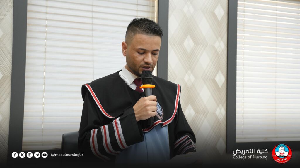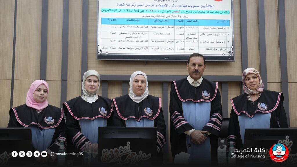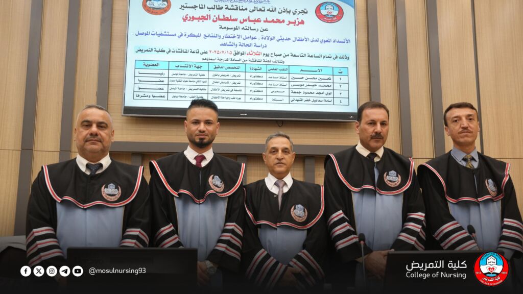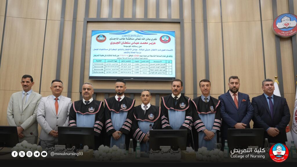 “الانسداد المعوي لدى الأطفال حديثي الولادة: عوامل الاختطار والنتائج المبكرة في مستشفيات الموصل – دراسة الحالة والشاهد”، وذلك على قاعة المناقشات في كلية التمريض / جامعة الموصل.