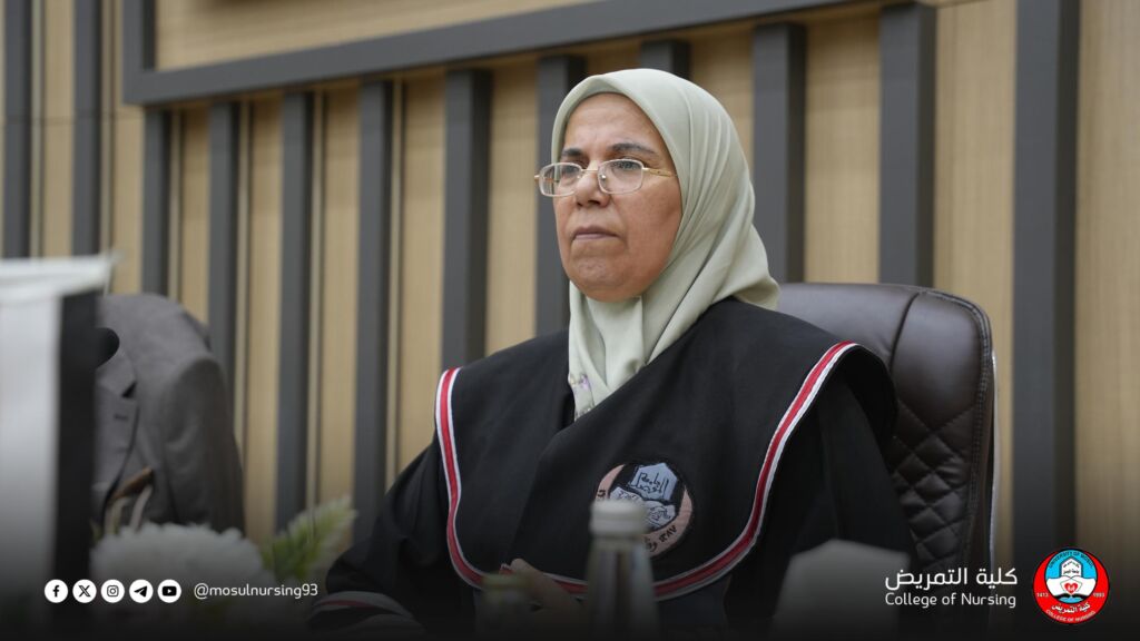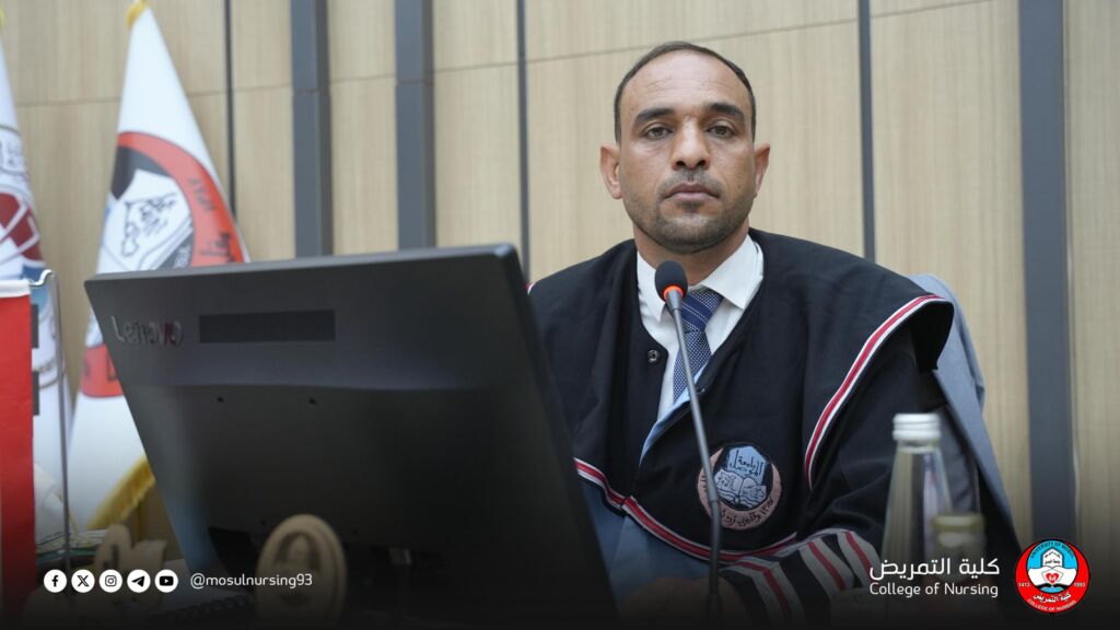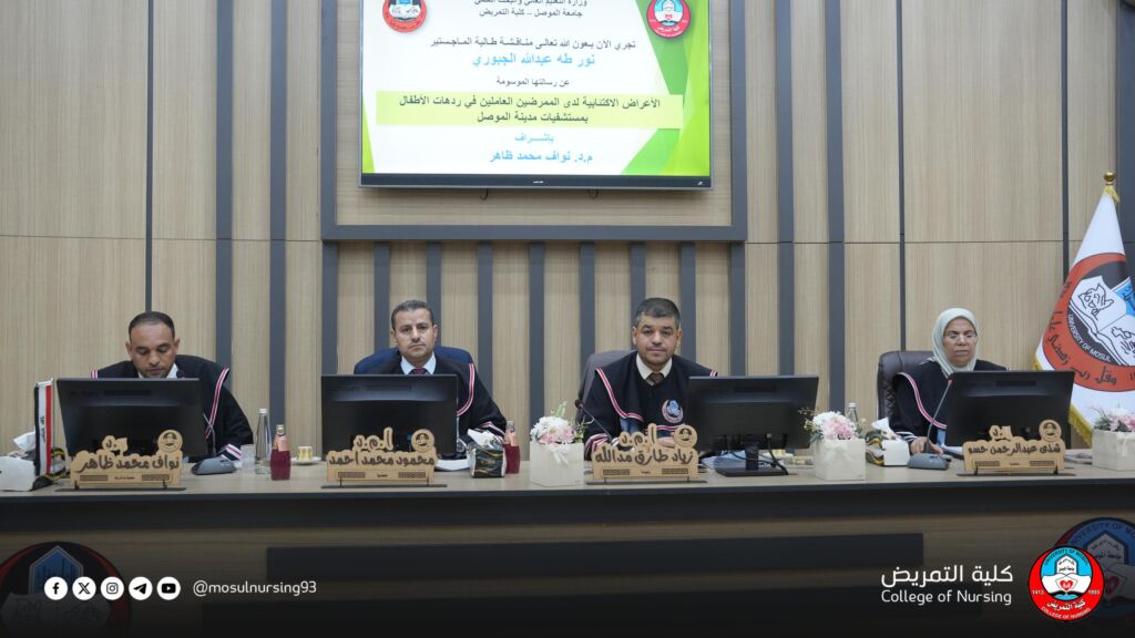 “الأمراض الاكتئابية لدى الممرضين العاملين في ردهات الأطفال بمستشفيات مدينة الموصل”، وذلك على قاعة المناقشات في كلية التمريض / جامعة الموصل.