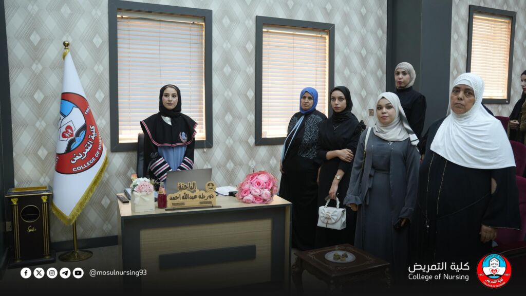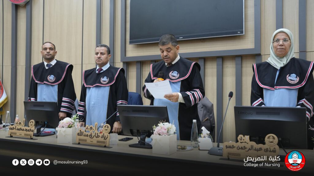 بحضور السيد عميد كلية التمريض في جامعة الموصل الأستاذ المساعد الدكتور تحسين محسن حسين، والدكتور ريان إبراهيم خليل معاون العميد للشؤون الإدارية والمالية، جرت صباح اليوم الثلاثاء الموافق 29 تموز 2025، مناقشة رسالة الماجستير المقدّمة من الطالبة نور طه عبدالله أحمد، والموسومة: