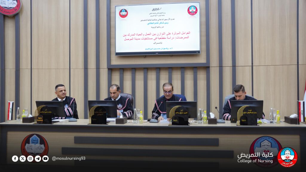 العوامل المؤثرة على التوازن بين العمل والحياة المدرك بين الممرضات دراسة مقطعية في مستشفيات مدينة الموصل”، وذلك على قاعة المناقشات في كلية التمريض / جامعة الموصل.