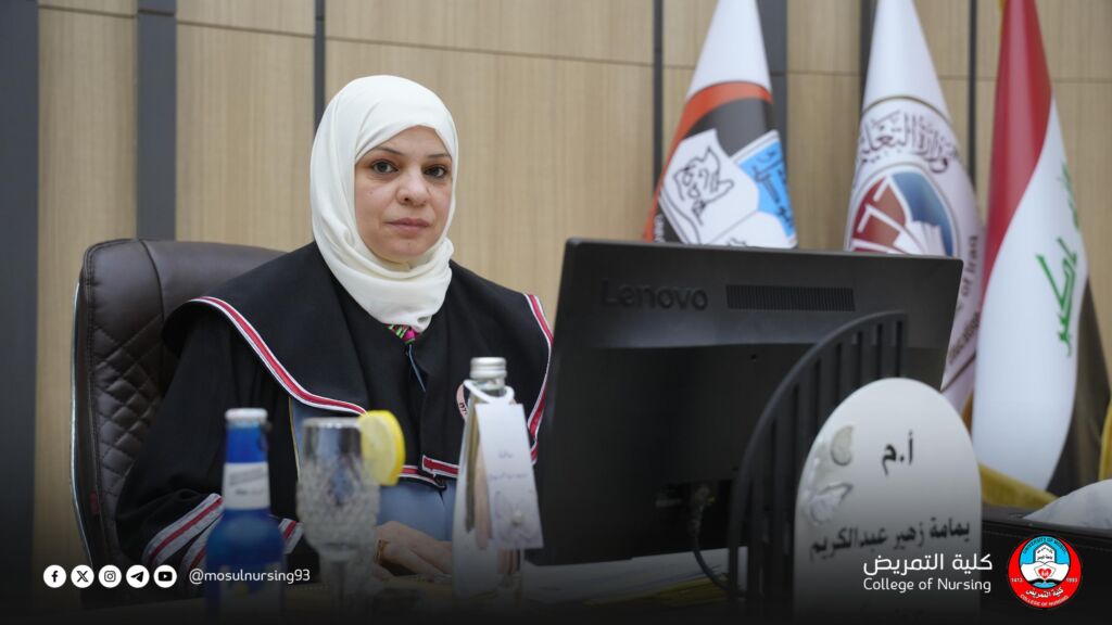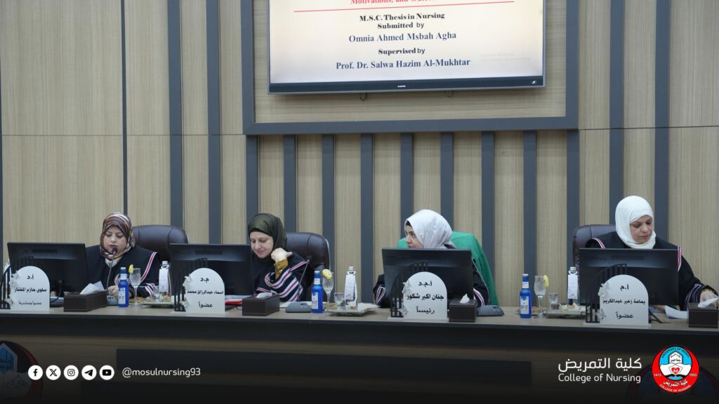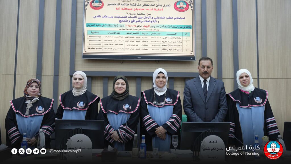 بحضور السيد عميد كلية التمريض في جامعة الموصل، الأستاذ المساعد الدكتور تحسين محسن حسين، والسيد عميد كلية التمريض في جامعة نينوى، الأستاذ الدكتور رضوان حسين إبراهيم، جرت صباح اليوم الأربعاء الموافق 26 حزيران 2025، مناقشة رسالة الماجستير المقدّمة من الطالبة أمنية أحمد مصباح، والموسومة: