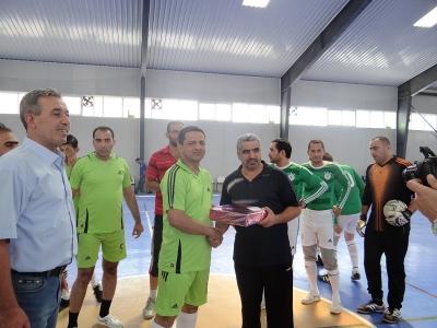 هدية تذكارية من فريق اساتذة كلية التمريض الى فريق اساتذة كلية الصيدلة قدمها الاستاذ المساعد الدكتور رضوان حسين ابراهيم عميد الكلية للدكتور وليد ذنون مدرس التربية الرياضية في كلية الصيدلة قبل المباراة تجسيدا للروح الرياضية العالية التي يتمتع بها فريق اساتذة كلية التمريض.