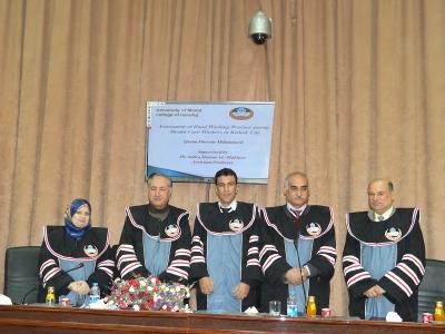نوقشت صباح اليوم الاحد والموافق 30/12/2012 رسالة الماجستير للطالب قاسم حسين محمد عزيز والموسومة (تقييم مدى التزام العاملين في المجال الصحي بغسل اليدين في مدينة كركوك) وعلى قاعة المناقشات في كلية التمريض. وتألفت لجنة المناقشة من السادة :-أ.م. د. طه حسن طه الصائغ رئيس اللجنةأ.م. د. حسين هادي عطية الابراهيمي عضواأ.م. د. اسماعيل ابراهيم داؤود السنجري عضواأ.م. د. سلوى حازم غيلان المختار عضوا ومشرفا