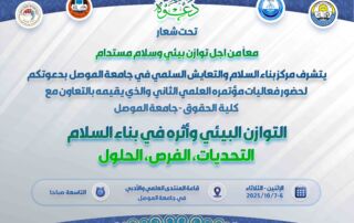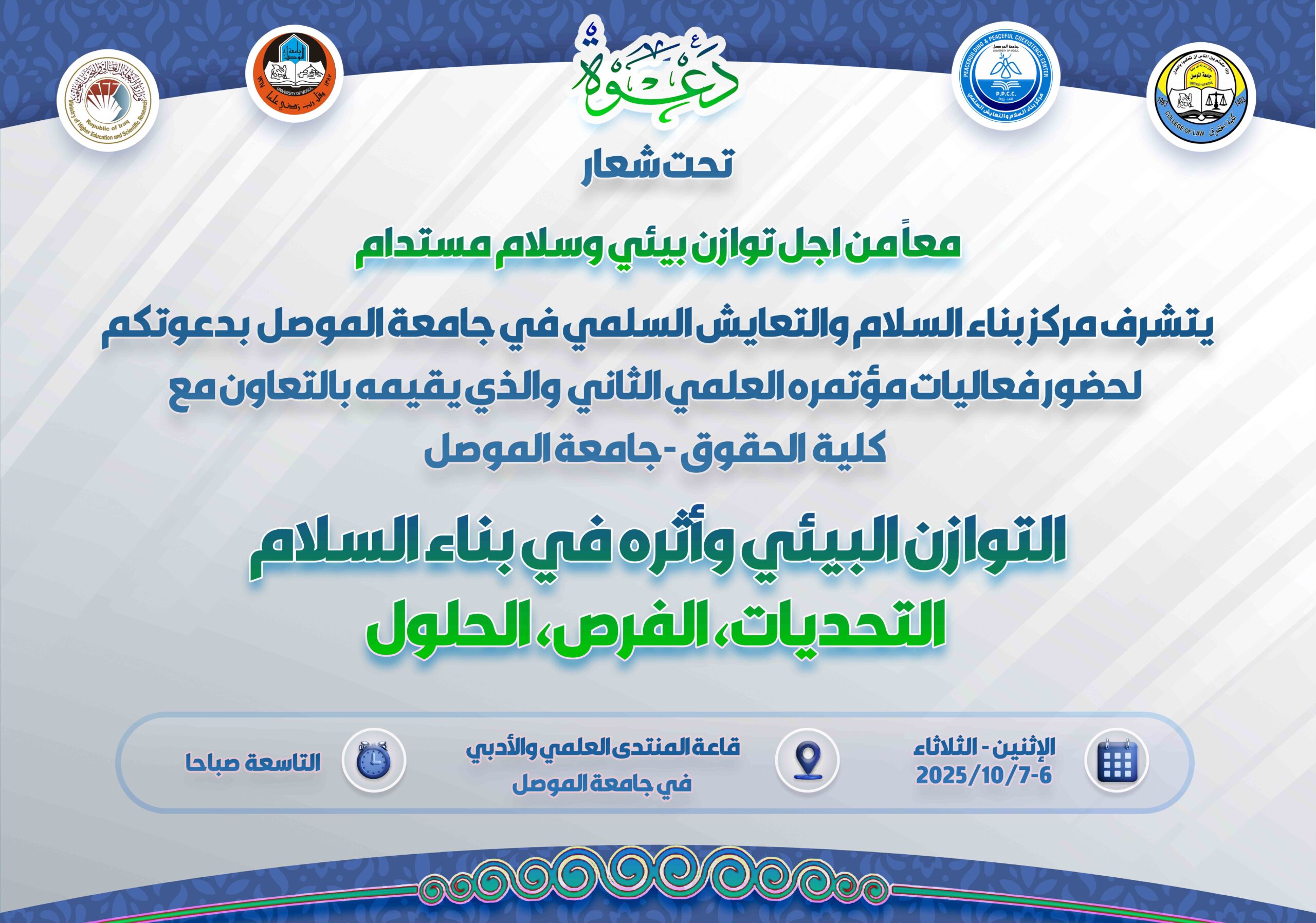 يقيم مركز بناء السلام والتعايش السلمي مؤتمره العلمي الثاني بالتعاون مع كلية الحقوق / جامعة الموصل بعنوان (التوازن البيئي واثره في بناء السلام .... التحديات ، الفرص ، الحلول) وذلك يومي 6-7 تشرين الاول وعلى [إقرأ المزيد]