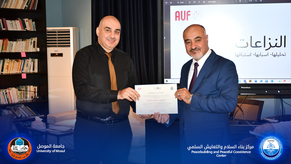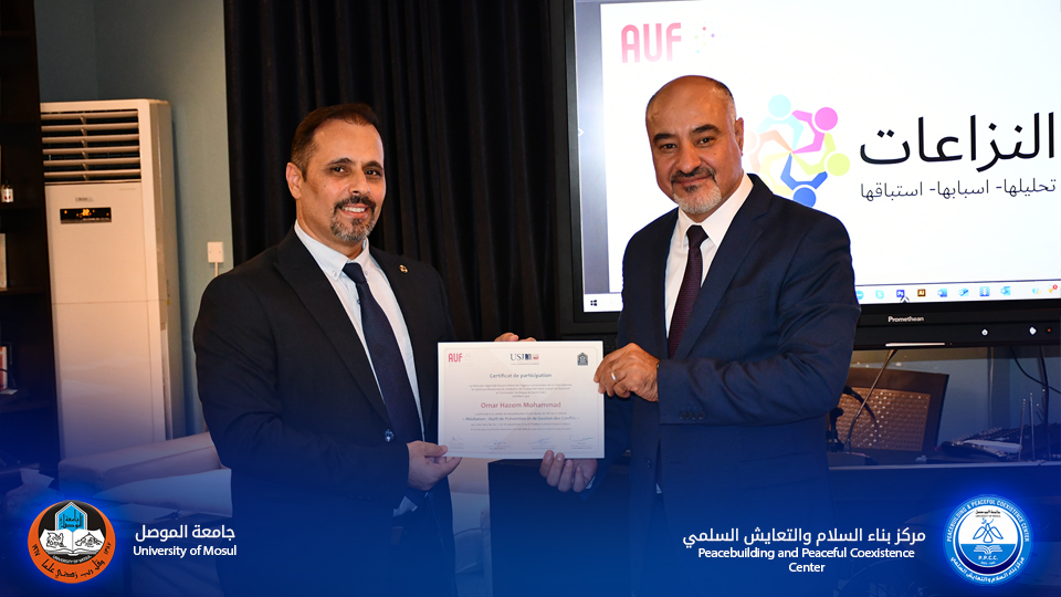 اختتمت دورة بناء القدرات والوساطة في إدارة النزاعات التي استمرت لمدة ثلاثة ايام في رحاب قاعة المعهد الثقافي الفرنسي بجامعة الموصل. اقيمت هذه الدورة بالتعاون ما بين مركز بناء السلام والتعايش السلمي في جامعة الموصل والوكالة الجامعية الفرانكوفونية في الشرق الأوسط ومركز الوساطة المهنية التابع لجامعة القديس يوسف في لبنان. وشارك في هذه الدورة تدريسيي مركزنا وعدد من منتسبي الجامعة التقنية الشمالية، وتضمنت الدورة المفاهيم الأساسية للنزاعات وانواعها والتصرف حيالها بعد معرفة مسبباتها، ودور الوسيط في تقريب وجهات النظر وإزالة الغموض فيما يتعلق بالتصورات والاحكام المسبقة، وأخيراً تطرقت الدورة الى موضوعات استباق النزاعات والعمل على حلها قبل تفاقمها. وتأتي هذه الجهود ضمن سعي المركز لبناء القدرات الجامعية والمجتمعية بما يعزز بناء السلام والتعايش السلمي
