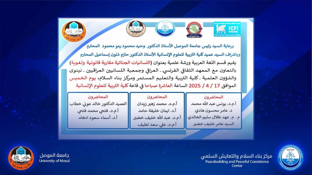 شارك مركز بناء السلام والتعايش السلمي في جامعة الموصل في الورشة العلمية التي اقامتها كلية التربية للعلوم الإنسانية يوم الخميس الموافق 17 نيسان 2025 بعنوان (اللسانيات الجنائية – مقاربة قانونية ولغوية) وشارك فيها كل من مدير المركز الأستاذ المساعد الدكتور فتحي محمد فتحي الحياني بورقة بحثية بعنوان “اثر تغير الدلالات اللفظية على فاعلية اللغة القانونية… النصوص الدولية انموذجا” ورئيس اللجنة العلمية في المركز الأستاذ الدكتورة أسماء سعود الخطاب بورقة بحثية بعنوان ” لغة الجسد في التحقيقات الجنائية”.