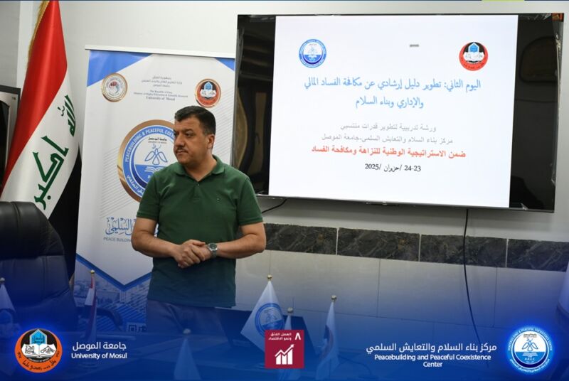 في اطار تنفيذ الاستراتيجية الوطنية للنزاهة ومكافحة الفساد وتحقيقا للهدف الثامن من اهداف التنمية المستدامة الخاص بـ(العمل اللائق ونمو الاقتصاد) اختتمت يوم أمس الثلاثاء أعمال الورشة التدريبية عن مواجهة الفساد المالي والاداري والتي استمرت ليومين وبمشاركة كافة منتسبي مركز بناء السلام والتعايش السلمي من الباحثين والموظفين، تناول اليوم الأول موضوع اليات هيئة النزاهة في مكافحة الفساد أما اليوم الثاني فتناول تطوير دليل إرشادي لمكافحة الفساد وعلاقته ببناء السلام . وتخلل التدريب تمارين عملية لترسيخ الجانب التطبيقي للدورة.