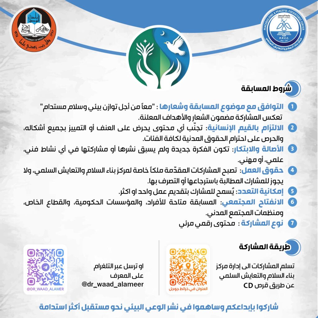 يعلن مركز بناء السلام والتعايش السلمي في جامعة الموصل لكل صناع المحتوى الرقمي المرئي الهادف عن إطلاق مسابقة السلام الإبداعية بدورتها الثانية والمخصصة للمحتوى الرقمي المرئي تحت شعار (معاً من أجل توازن بيئي وسلام مستدام) وهي مسابقة مفتوحة لكل المبدعين من الجنسين داخل وخارج الجامعة وهي فرصة لإطلاق العنان للأفكار الإبداعية التي تقدم خدمة للبيئة والمجتمع وتأتي هذه المسابقة انطلاقاً من رؤية المركز في تعزيز المسؤولية المجتمعية العامة وحرصاً منه على إتاحة الفرصة للإبداع والمبدعين لنشر محتواهم الراقي الذي يسهم في حماية بيئتنا الطبيعية ويعزز ثقافة المجتمع بما يسهم في تحقيق الهدف الثالث عشر من أهداف التنمية المستدامة (العمل المناخي).