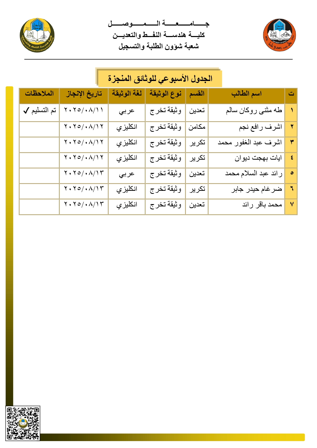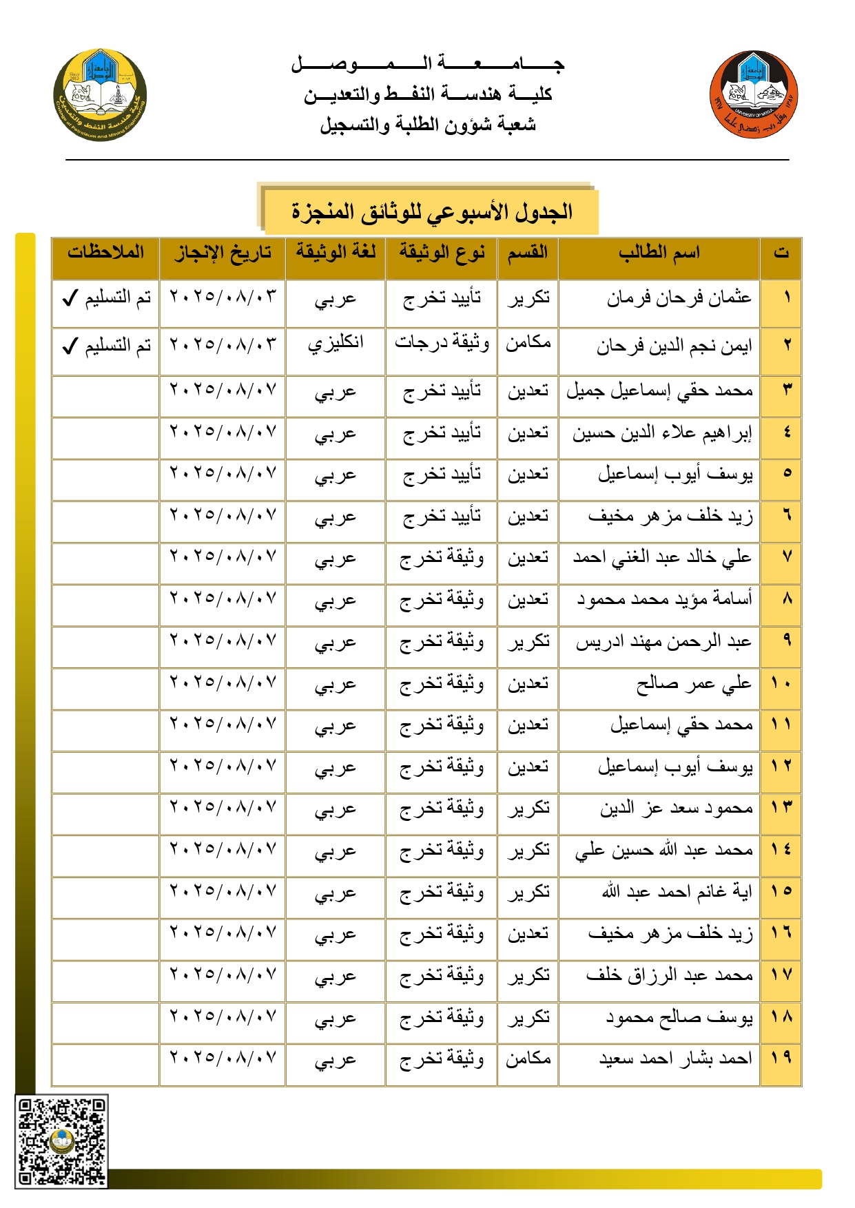 تُعلن شعبة شؤون الطلبة والتسجيل في كلية هندسة النفط والتعدين – جامعة الموصل عن إنجاز عدد من الوثائق المصدّقة والمزوّدة برمز التحقق (QR). يُرجى من [إقرأ المزيد]