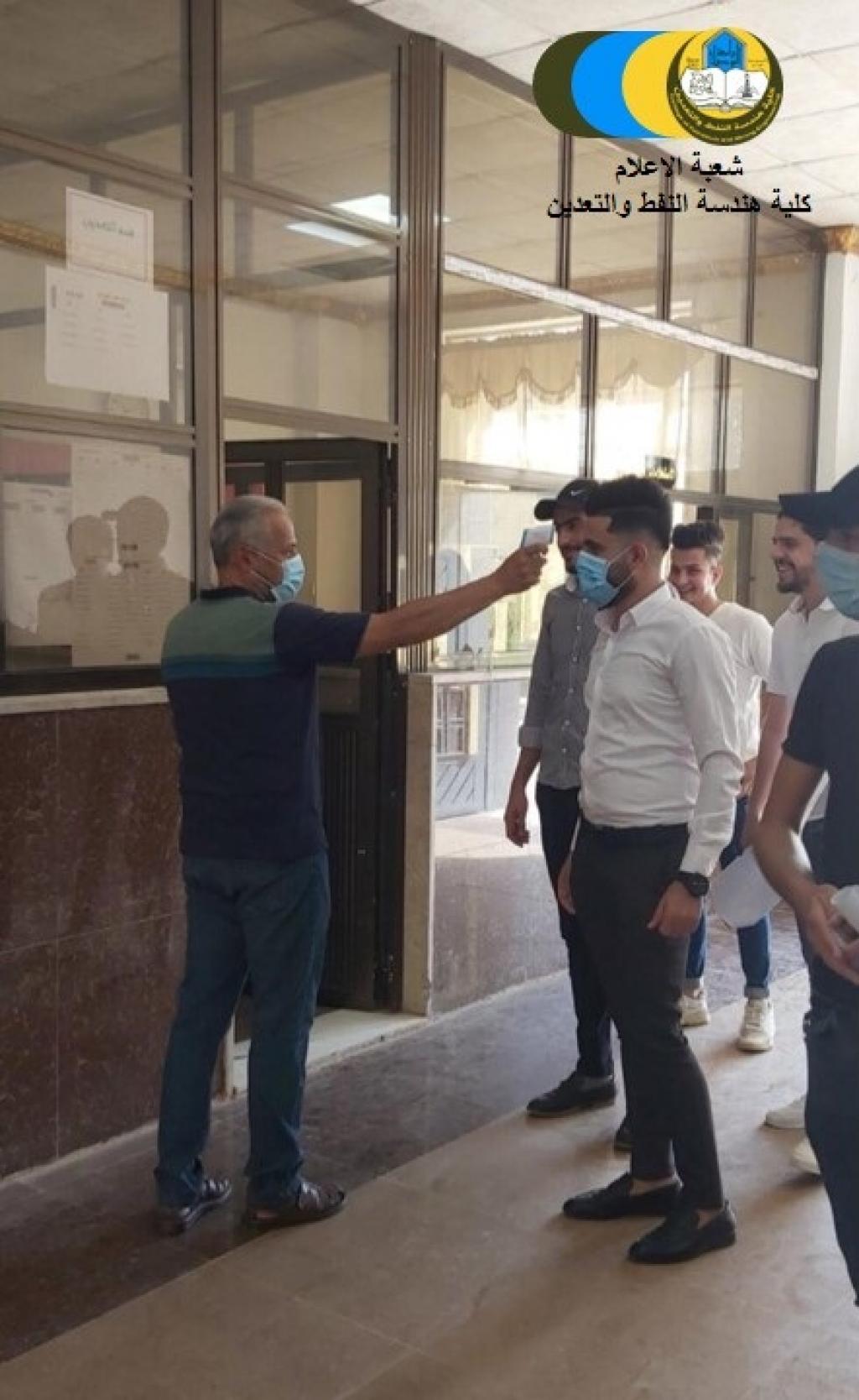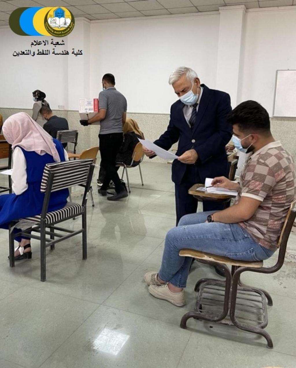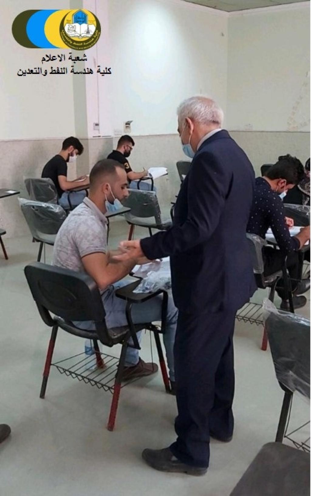 تفقد السيد عميد كلية هندسة النفط والتعدين أ. د. نبيل يوسف البنا سير الامتحانات الحضورية اليوم ٢٠٢١/٧/٢٦ . وأكد سيادته على الإجراءات الصحية من تعفير القاعات الامتحانية قبل موعد الامتحان وكذلك فحص الطلبة بالأجهزة الحرارية عند دخولهم للكلية واتخاذ الإجراءات الإدارية المناسبة في حالة ظهور أي شك في الإصابة. متمنيا لاعزاءنا الطلبة الصحة والتوفيق.