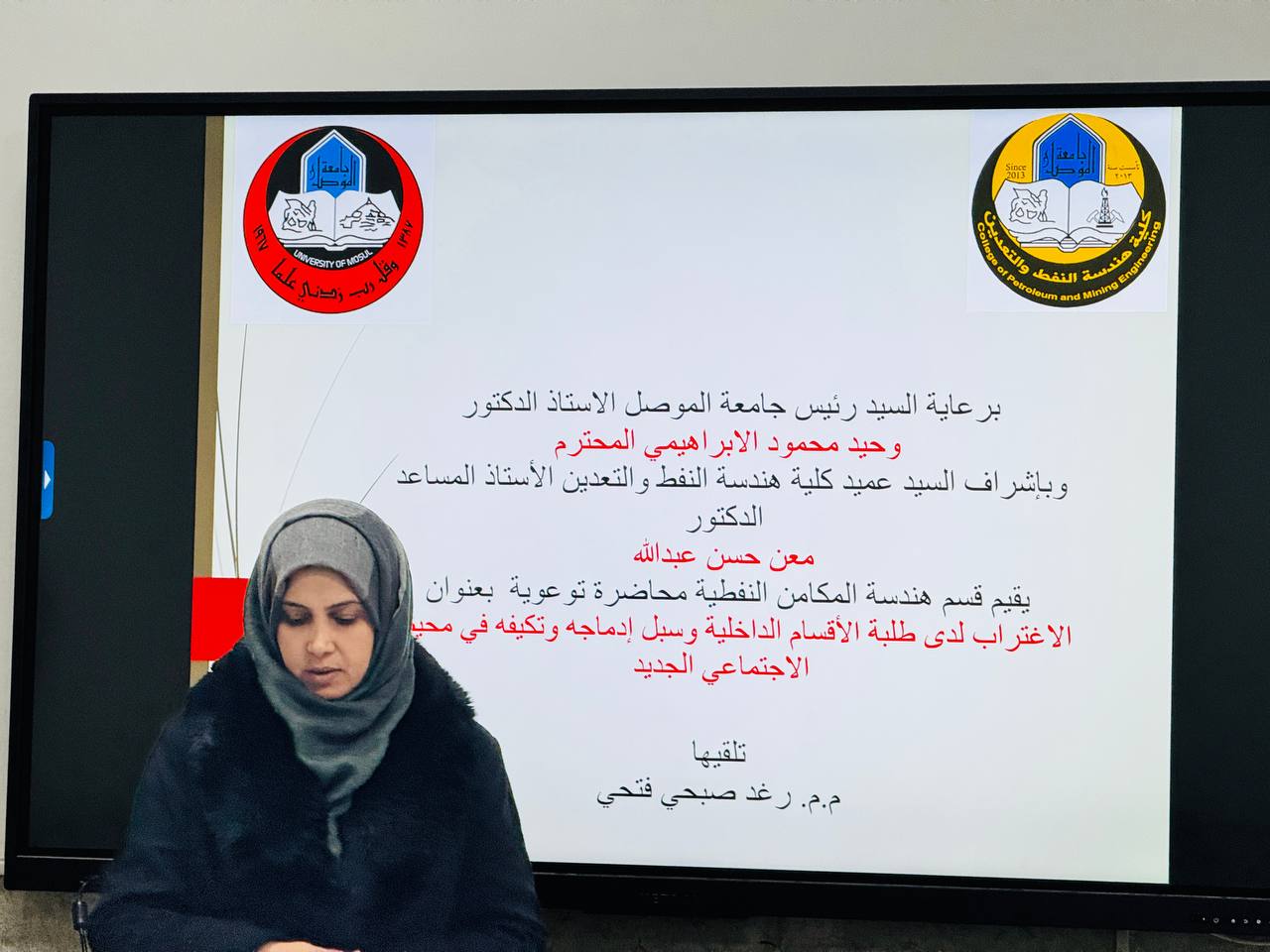 نظمت كلية هندسة النفط والتعدين، ضمن نشاطات شعبة الإرشاد النفسي الجامعي، محاضرة توعوية لطلبة الأقسام الداخلية في قسم هندسة المكامن النفطية، بعنوان: