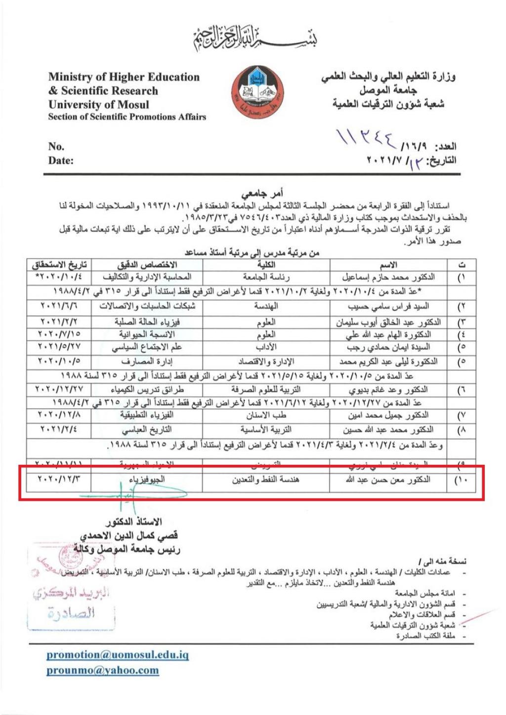 تم ترقية السيد معاون العميد للشؤون الادارية في كلية هندسة النفط والتعدين في جامعة الموصل، الدكتور معن حسن عبد الله في اختصاص الجيوفيزياء، الى مرتبة “الاستاذ المساعد” اعتبارا من 3/ 12/ 2020 ، متمنين له دوام الموفقية والعطاء العلمي المستمر.