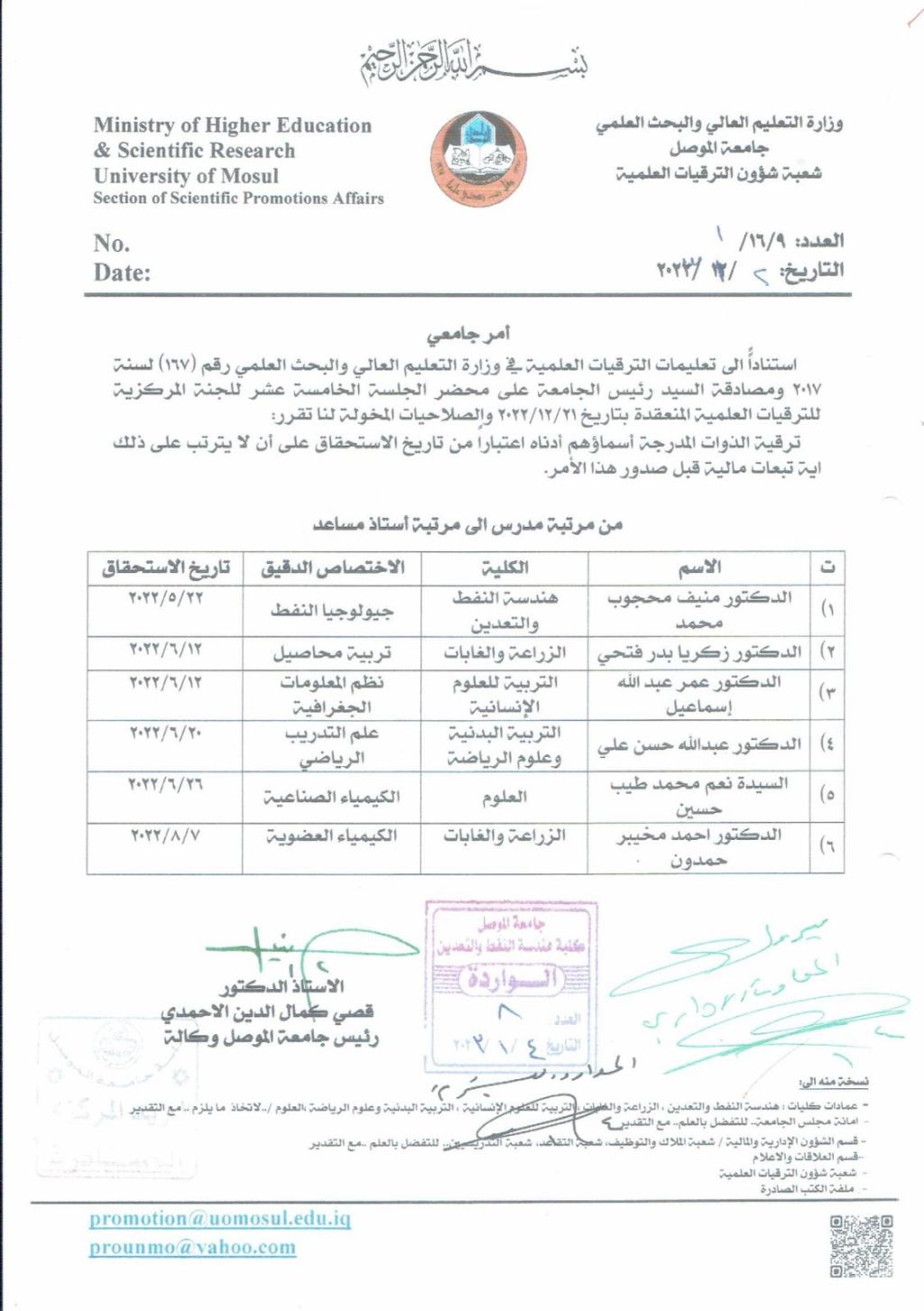 صدور الأمر الجامعي ذو العدد 9/16/1 بتاريخ 2/1/2023 بترقية الدكتور منيف محجوب محمد (رئيس قسم هندسة النفط والتكرير) لمرتبة أستاذ مساعد في اختصاص جيولوجيا النفط.تتقدم اسرة كلية هندسة النفط والتعدين بهذه المناسبة بأحر التهاني والتبريكات للدكتور منيف بمناسبة ترقيته وتتمنى له الموفقية والنجاح ومزيدا من العطاء خدمة لجامعتنا.