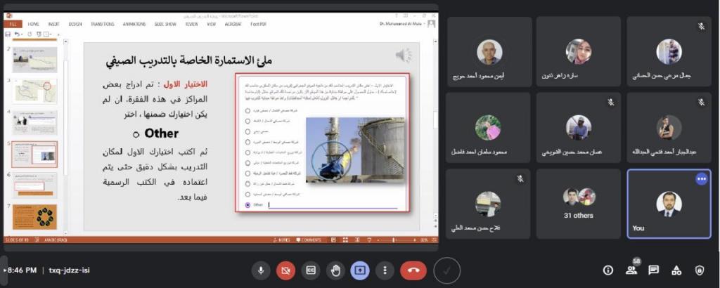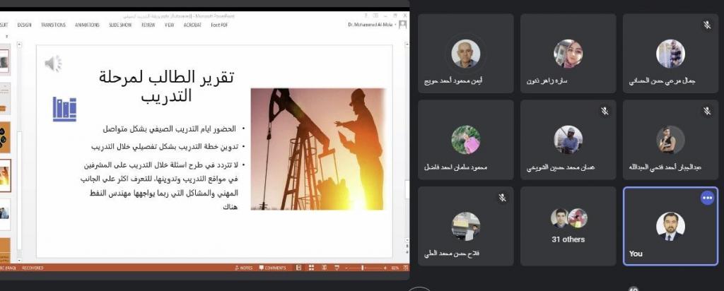 ضمن سلسلة فعاليات وحدة التعليم المستمر في كلية هندسة النفط والتعدين ، اقامة لجنة التدريب الصيفي في الكلية متمثلة بـــــــ د. ايمن محمود احمد و د. محمد حسين احمد و د. محمود سلمان احمد ، ورشة عمل بعنوان: “خطوات اختيار موقع التدريب الصيفي” ، كـأحد المتطلبات الدراسية لاكمال المرحلة الثالثة لطلبة الاقسام العلمية في الكلية، بـتاريخ الثلاثاء: 08/ 03/ 2022 ، عبر منصة الــ Google Meet.حيث شارك في الورشة مجموعة كبيرة من طلبة المرحلة الثالثة للاقسام العلمية الثلاثة ، و تمت الاجابة على جميع التساؤلات الموجهة من قبل الطلبة في اختيار مواقع التدريب و تهيئة الطلبة لخطوات السير التدريبي في العطلة الصيفية المقبلة.