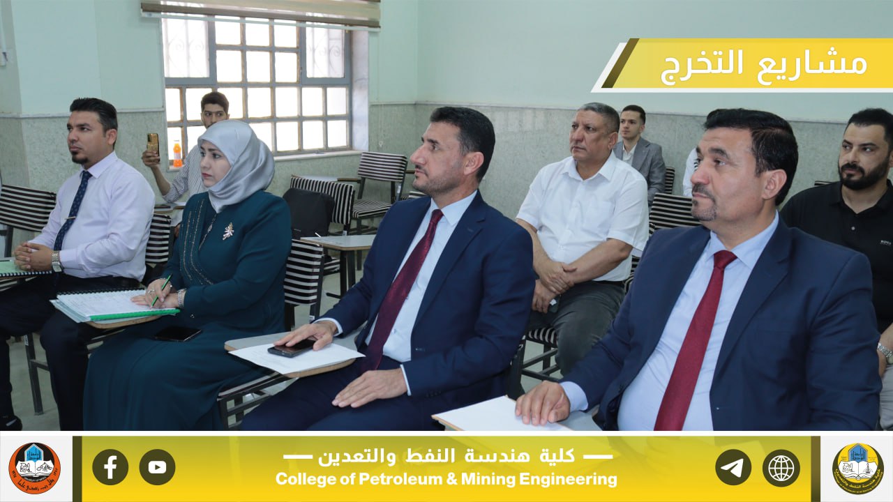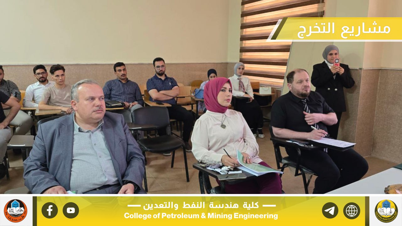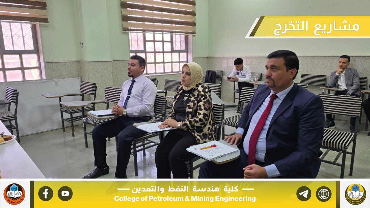 بإشراف السيد عميد كلية هندسة النفط والتعدين الأستاذ المساعد الدكتور معن حسن عبدالله المحترم، جرت صباح يوم الخميس الموافق 22 أيار 2025 مناقشة مشاريع التخرج لطلبة المرحلة الرابعة في أقسام الكلية الثلاثة، والتي تُعد من المتطلبات الأساسية للتخرج والاستعداد للانخراط في سوق العمل ومؤسسات الدولة ذات العلاقة.