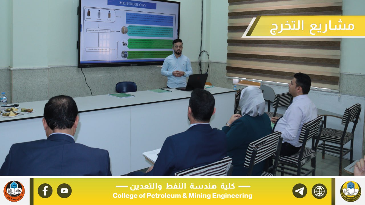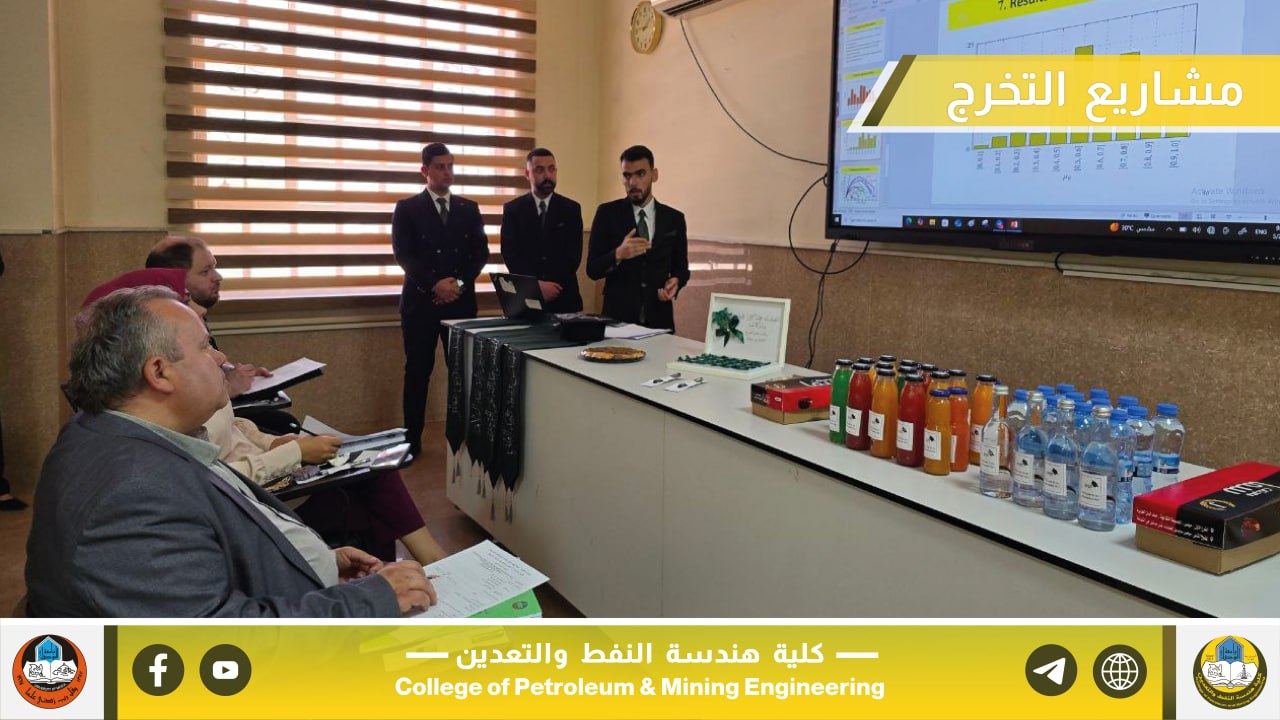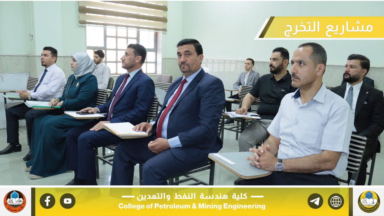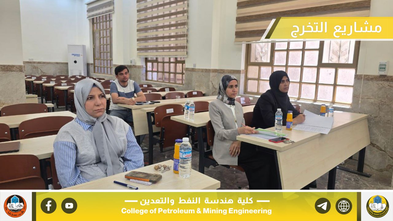 بإشراف السيد عميد كلية هندسة النفط والتعدين الأستاذ المساعد الدكتور معن حسن عبدالله المحترم، جرت صباح يوم الخميس الموافق 22 أيار 2025 مناقشة مشاريع التخرج لطلبة المرحلة الرابعة في أقسام الكلية الثلاثة، والتي تُعد من المتطلبات الأساسية للتخرج والاستعداد للانخراط في سوق العمل ومؤسسات الدولة ذات العلاقة.