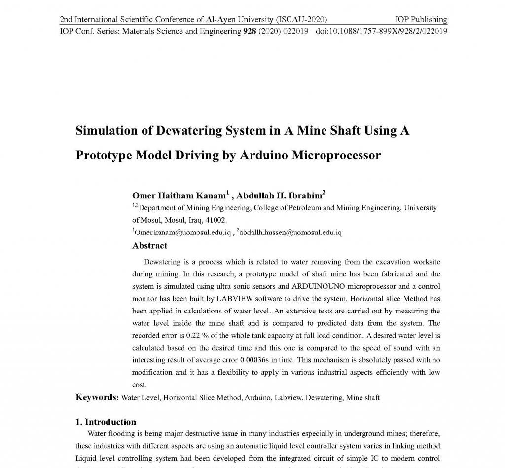 شارك تدريسيون من قسم هندسة التعدين في كلية هندسة النفط والتعدين (م.م. عمر هيثم غانم و م.م. عبد الله حسين ابراهيم) في اعمال المؤتمر الدولي الثاني لجامعة العين الذي انعقد في الفترة 15 – 16 من تموز 2020 بالبحث الموسوم:Simulation of Dewatering System in a Mine Shaft Using a Prototype Model Driving by Arduino Microprocessorيتلخص البحث حول عملية إزالة المياه من موقع العمل أثناء عمليات التعدين في المناجم تحت السطحية، حيث تم تصنيع نموذج ووضعه تحت ظروف مختبرية عدة بإستخدام نظام المستشعرات فوق الصوتية بواسطة معالج Arduino و النشر في مجلة Materials Science and Engineering ، التي تقع ضمن مستوعب سكوبس.