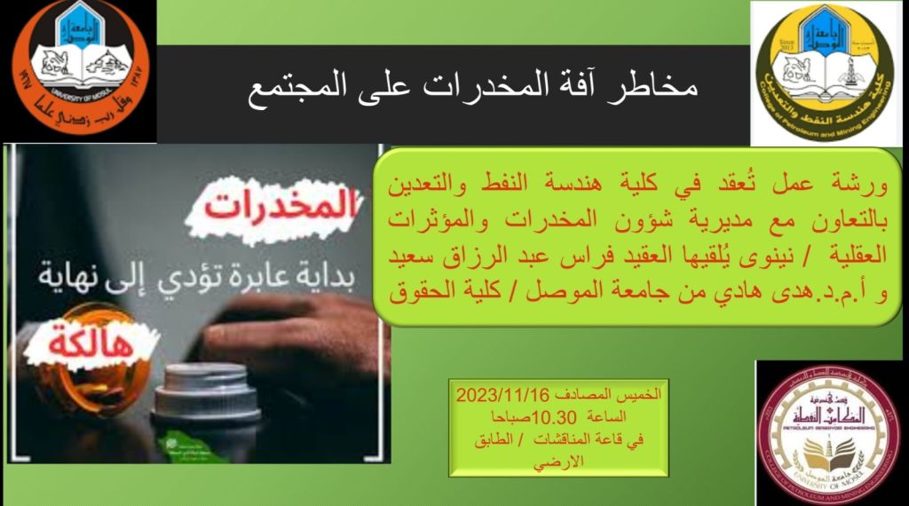 برعاية الأستاذ الدكتور قصي كمال الدين الأحمدي رئيس جامعة الموصل المحترم وباشراف الأستاذ المساعد الدكتور معن حسن عبدالله عميد الكلية وكالة وبمناسبة الأسبوع العالمي لريادة الأعمال أقامت كلية هندسة النفط والتعدين بالتعاون مع شعبة التأهيل والتوظيف في رئاسة الجامعة اليوم الأربعاء الموافق ١٥-١١-٢٠٣٣ ورشة العمل الموسومة (مهارات تنظيم المشاريع “ريادة الاعمال”) ألقى فيها م.م. ياسر فارس مسؤول وحدة التأهيل والتوظيف في الكلية محاضرة لطلبة المرحلة الرابعة تناولت نبذة عن ريادة الأعمال وما هي الخصائص والسمات التي يتميز بها رواد الأعمال وكيفية تنمية مهارات إنشاء وإدارة المشاريع الريادية.مدي رئيس جامعة الموصل المحترم وباشراف الأستاذ المساعد الدكتور معن حسن عبدالله عميد الكلية وكالة وبمناسبة الأسبوع العالمي لريادة الأعمال أقامت كلية هندسة النفط والتعدين بالتعاون مع شعبة التأهيل والتوظيف في رئاسة الجامعة اليوم الأربعاء الموافق ١٥-١١-٢٠٣٣ ورشة العمل الموسومة (مهارات تنظيم المشاريع “ريادة الاعمال”) ألقى فيها م.م. ياسر فارس مسؤول وحدة التأهيل والتوظيف في الكلية محاضرة لطلبة المرحلة الرابعة تناولت نبذة عن ريادة الأعمال وما هي الخصائص والسمات التي يتميز بها رواد الأعمال وكيفية تنمية مهارات إنشاء وإدارة المشاريع الريادية.
