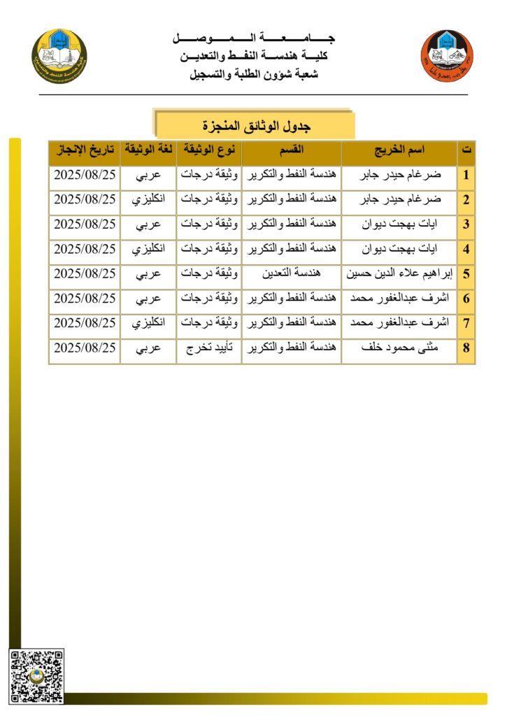 تُعلن كلية هندسة النفط والتعدين – جامعة الموصل عن بدء امتحانات الدور الثاني للعام الدراسي الحالي، وتدعو جميع الطلبة إلى الالتزام التام بالمواعيد والتعليمات الامتحانية المعتمدة.