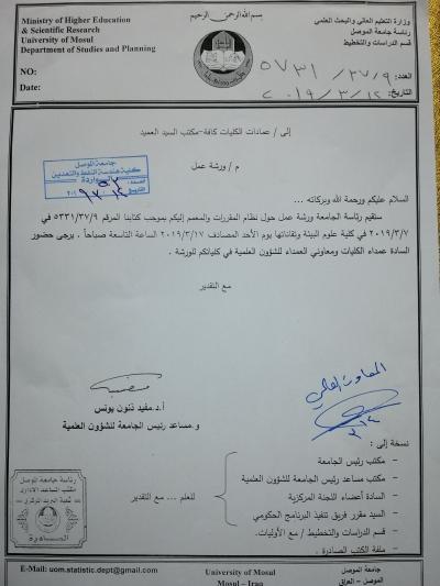 الأستاذ الدكتور مفيد ذنون يونس مساعد رئيس الجامعة للشؤون العلمية المحترموالأستاذ الدكتور نبيل البنا وكيل عميد كلية هندسة النفط والتعدين والسادة عمداء الكليات ومعاوني العمداء للشؤون العلمية المحارمون يحضرون ورشة العمل لرئاسة جامعة الموصل حول نظام المقررات التي اقيمت في قاعة كلية علوم البيئة وتقاناتها صباح هذا اليوم عند الساعة التاسعة تنفيذا لكتاب رئاسة الجامعة قسم الدراسات والتخطيط العدد 9/37/5731 في 12/3/2019.