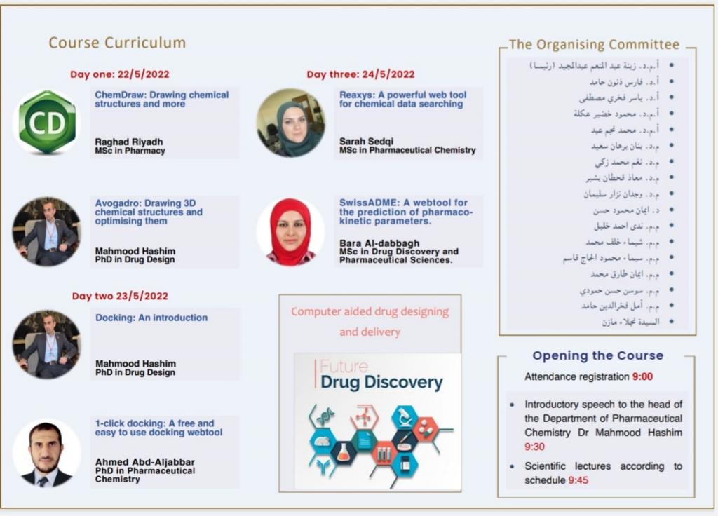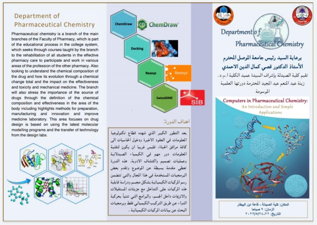 Computer in Pharmaceutical Chemistry: An Introduction and Simple Applicationsعلى قاعة ابن البيطار (كلية الصيدلة – الطابق الاول) للمدة من ٢٢-٢٤/ايار/٢٠٢٢ الساعة التاسعة صباحا.تهدف الدورة الى تسليط الضوء على اهمية الحاسبات وتقنيات المعلومات في الكيمياء الصيدلانية وعمليات تصميم واكتشاف الادوية