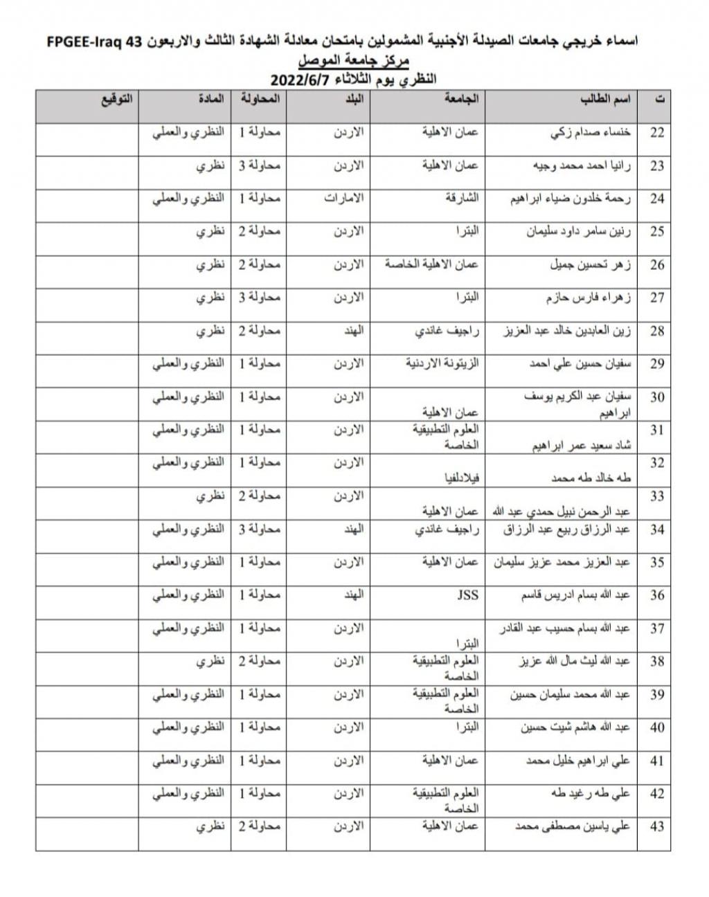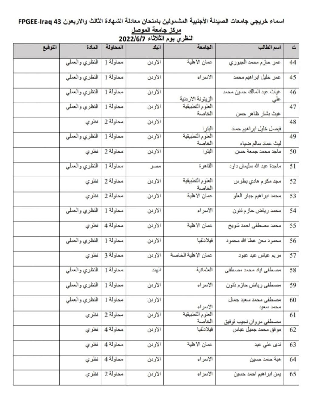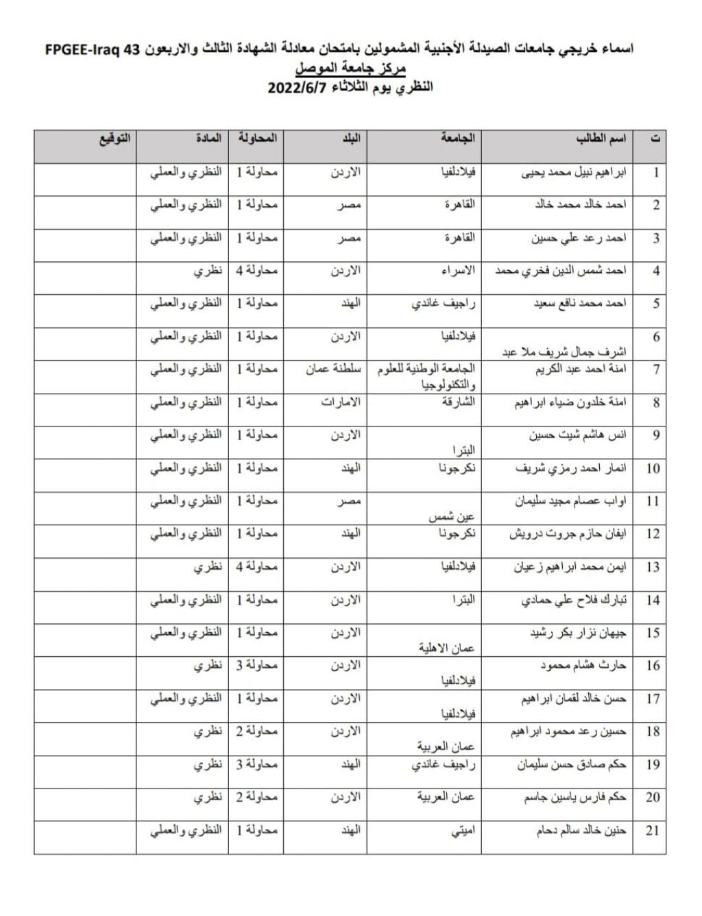 تعلن لجنة معادلة الشهادة في كلية الصيدلة / جامعة الموصل عن القوائم النهائية لامتحان معادلة الشهادة 43 , فعلى جميع المتقدمين من المدرجة اسمائهم ادناه التقيد بالتعليمات الامتحانية.التعليماتعلى جميع الممتحنين ابراز وثيقتين رسميتين اصليتين لدخول جميع الامتحانات، الاولى تكون جواز السفر والاخرى تكون اما البطاقة الوطنية الموحدة او اجازة السوق او هوية الاحوال المدنية وبصوره حديثة وسيحرم الطالب من دخول قاعة الامتحان.على جميع الطلبة الممتحنين جلب بطاقة التلقيح او فحص PCR سالب وحديث (لايزيد عن ٣ أيام قبل موعد الامتحانات) وبخلافه سوف لن يتم السماح بأداء الامتحان.يكون موعد الامتحان الساعة 9:00 صباحا يوم الثلاثاء 7/6/2022 في قاعة رقم ١ – الطابق الاول- كلية الصيدلة- جامعة الموصل، ويجب على الطلبة الدخول لقاعة الامتحان قبل موعد الامتحان بنصف ساعة لغرض تدقيق الثبوتات الشخصية من قبل المراقبين ويكون وقت الامتحان 3 ساعات فقط غير قابلة للتمديد اما الامتحان العملي فسيجري الجزء النظري منه يوم الخميس 9/6/2022 ولمدة ساعة واحدة فقط (يبدأ الساعة 12:30 بعد الظهر).دخول الامتحان يكون فقط للمتقدمين الموجودة اسمائهم في القائمة من الذين قاموا بدفع أجور المحاولة.سوف لن يسمح لأي طالب بالخروج والعودة الى قاعة الامتحان بعد توزيع الاسئلة ومهما كانت الاسباب.ستكون اجابات الطلبة ضمن (Answer Sheet) وتكون خاصة لكل طالب ويستعمل فيها القلم الجاف الاسود او الازرق فقط وغير مسموح باستعمال القلم الرصاص او القلم الحبر في الاجابة وكذلك ستهمل اي اجابة مثبتة على ورقة الاسئلة و لا يجوز الشطب او الحك على ورقة الاجابة.على جميع الممتحنين قراءة التعليمات الخاصة بطريقة الاجابة والتي ستكون مرفقة مع الاسئلة وقبل البدء بالاجابة.