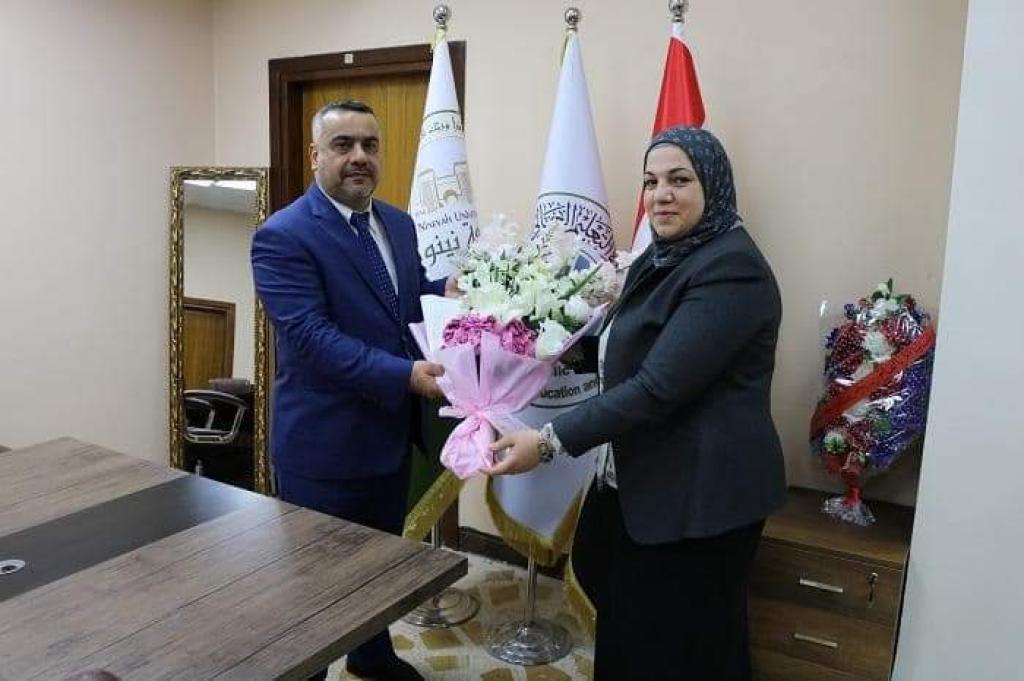 استقبل السيد رئيس جامعة نينوى الاستاذ الدكتور أسامة إسماعيل المشهداني في مكتبه يوم الخميس الموافق ٢٠٢٠/١١/١٢ كل من السيدة عميد كلية التمريض في جامعة الموصل أ. د. سلوى حازم المختار والسيدة عميد كلية الصيدلة في جامعة الموصل أ. م. د. زينة عبد المنعم ال ذنون.جاءت هذه الزيارة لتقديم التهاني والتبريكات للسيد رئيس جامعة نينوى بمناسبة تسنمه منصب إدارة رئاسة الجامعة حيث قدمت السيدة عميد كلية الصيدلة باقة من الزهور للسيد رئيس الجامعة كما قدمت السيدة عميد كلية التمريض درع الكلية متمنين له مزيدا من العطاء والتقدم خدمة لجامعة نينوى.من جانبه ثمن السيد رئيس جامعة نينوى دور القيادات الجامعية المتقدمة في جامعة الموصل الأم في رفد جامعتنا بالكوادر البشرية اللازمة للكليات المستحدثة تخلل ذلك تقديم كتابي شكر وتقدير لعميدي الكليتين تثمينا لجهودهم في تقديم الدعم اللوجستي ورفد كليتي الصيدلة والتمريض في جامعتنا بالكوادر التدريسية متمنيا لهم دوام العطاء والتقدم خدمة للمسيرة التعليمية في بلدنا العزيز.