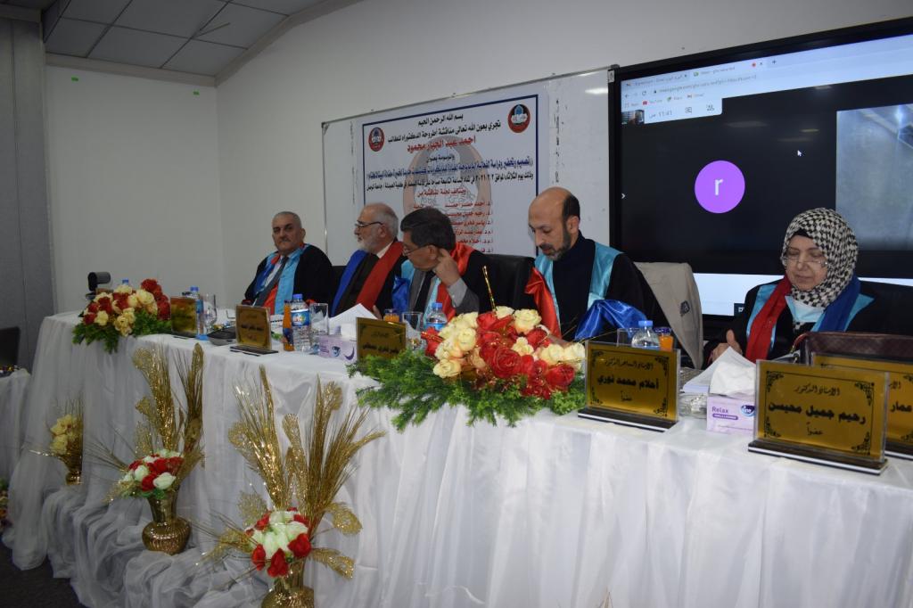 ترأس لجنة المناقشة الاستاذ الدكتور أحمد خضر احمد و تألفت لجنة المناقشة من كل من الاستاذ الدكتور رحيم جميل محيسن و الاستاذ الدكتور ياسر فخري مصطفى و الاستاذ المساعد الدكتور عمار عبدالرزاق كبة و الاستاذ المساعد الدكتورة احلام محمد نوري و الاستاذ الدكتور فارس ذنون العباجي (عضواً و مشرفاً) والاستاذ المساعد الدكتور محمد احمد العراقي(عضوا و مشرفاً)