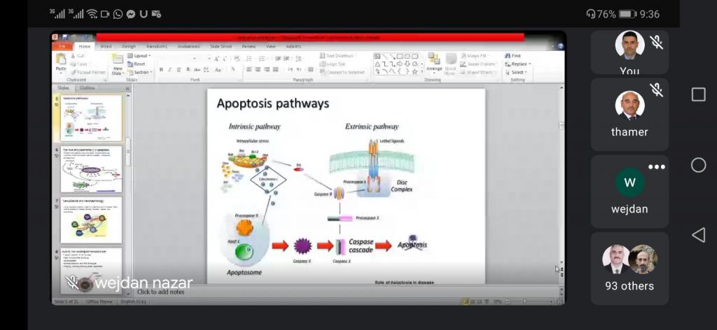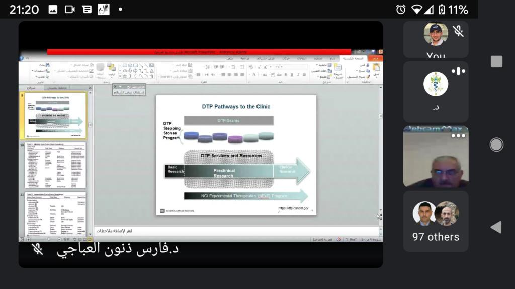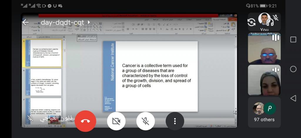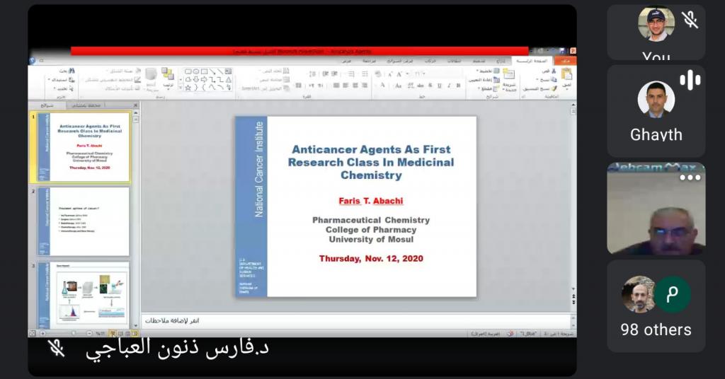 الندوة العلمية لفرع الكيمياء الصيدلانيةبرعاية السيد رئيس جامعة الموصل الاستاذ الدكتور قصي كمال الدين الاحمدي المحترم واشراف مباشر من قبل السيدة عميد كلية الصيدلة الاستاذ المساعد الدكتورة . زينة عبدالمنعم عبدالمجيد المحترمة اقام فرع الكيمياء الصيدلانية في كلية الصيدلة ندوة افتراضية عبر المنصات الالكترونية Google Meet اليوم الخميس الموافق ١٢/ ١١/ ٢٠٢٠. جاءت الندوة تحت عنوان “الرؤى الجديدة في علاج السرطان باستخدام تقنيات الكيمياء الصيدلانية”.تطرقت الندوة إلى إمكانية علاج الأورام السرطانية المستعصية كسرطانات الكبد و القولون و الرئتين باستخدام تقنيات الكيمياء الصيدلانية و قدم المحاضرون في الندوة سلسلة من المحاضرات العلمية حول اخر المستجدات المتبعة لتصنيع واختبار المستحضرات الصيدلانية والطرق الحديثة والمبتكرة في تقييم فعالية الادوية من اجل استخدامها في علاج الامراض السرطانية . شهدت الندوة حضور عدد كبير من اساتذة كلية الصيدلة وجامعة الموصل وخلصت الندوة الى اهمية دور الكيمياء الصيدلانية والطبية في اثراء علاج الامراض وخاصة الامراض السرطانية كونها اللبنة الاساسية في تصنيع وابتكار معظم الادوية.