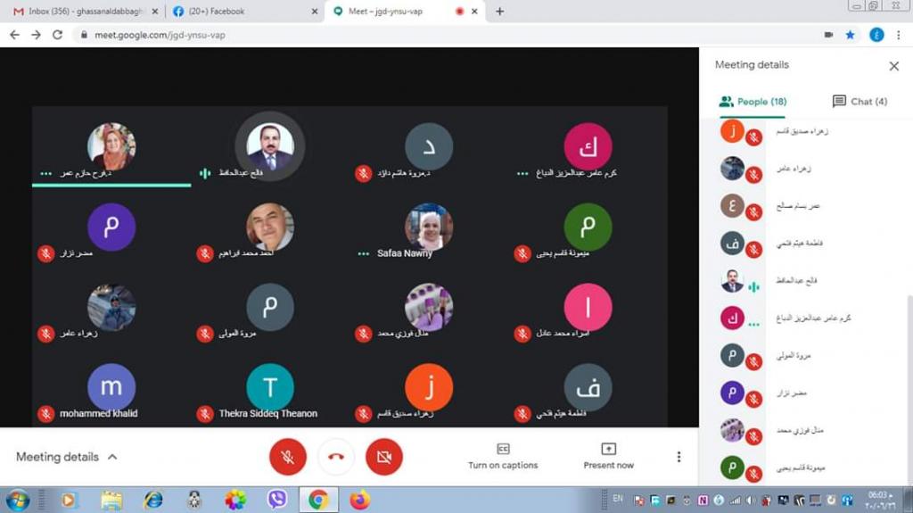 عقد فرع العلوم المختبرية السريرية يوم الجمعة الموافق 2020 /26/6 برئاسة السيدة رئيس الفرع د. فرح حازم عمر وبحضور السادة اعضاءاللجنة الامتحانية الالكترونية الفرعية اجتماعا عبر تطبيق Googl meet مع تدريسيي المواد العملية في الفرع وجرى خلال الاجتماع الاتفاق على الية اجراء الامتحان الالكتروني ووفق التعليمات الصادرة من عمادة الكلية واللجنة الامتحانية المركزية لغرض استكمال الامتحانات العملية النهائية على اتم وجه
