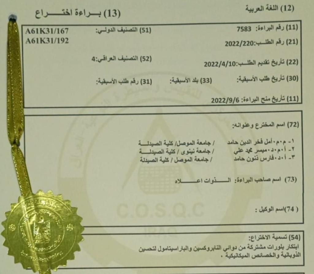حصلت التدريسية في كلية الصيدلة- فرع الكيمياء الصيدلانية م.م. امل فخرالدين حامد على براءة اختراع من وزارة التخطيط /جهاز التقييس والسيطرة النوعية وذلك عن ((ابتكار بلورات مشتركة من دوائي النابروكسين و الباراسيتامول لتحسين الذوبانية و الخصائص الميكانيكية)) وبالمشاركة مع عميد كلية الصيدلة في جامعة نينوى الاستاذ المساعد الدكتور ميسر محمد علي والاستاذ الدكتور فارس ذنون حامد التدريسي في فرع الكيمياء الصيدلانية- كلية الصيدلة جامعة الموصل.