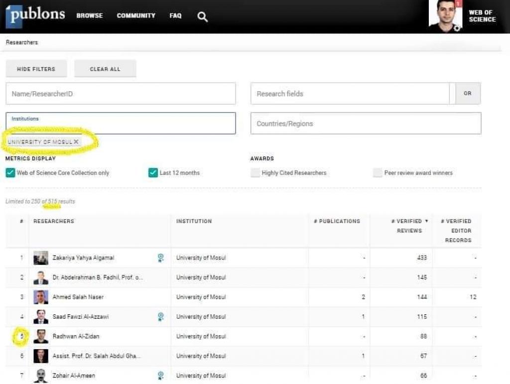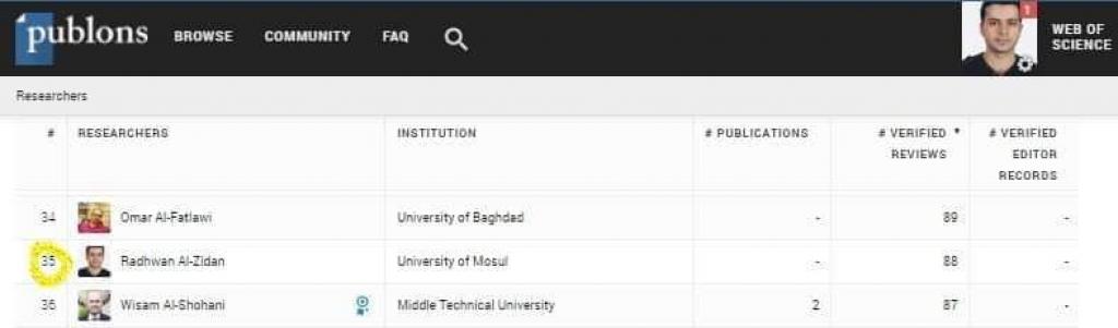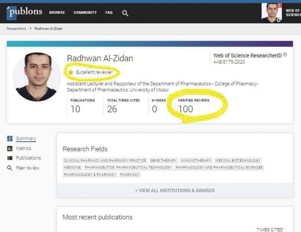 تمكن التدريسي في فرع الصيدلانيات رضوان نضال الزيدان من الوصل لحاجز ال 100 بحث مقيم لصالح العديد من المجلات العالمية ، كما حصل على لقب (مقيم ممتاز) من قبل موقع Publons المختص،و بذلك أصبح اول تدريسي من كلية الصيدلة/ جامعة الموصل يكسر هذا الرقم حسب موقع Publons. وتسلسله الحالي على مستوى جامعة الموصل هو الخامس كمقيم للبحوث العلمية العالمية خلال ال 12 شهر المنصرمة، أما على مستوى فكان تسلسله هو الخامس والثلاثين بين المقيمين من أصل أكثر من 17 ألف مقيم ولذلك فهو مركز متقدم جدا.وفي الوقت الذي تبارك فيه عمادة كلية الصيدلة ممثلة بالسيدة عميدة الكلية الاستاذ المساعد الدكتورة زينة عبد المنعم عبد المجيد والسادة منتسبي الكلية التدريسي الاختصاص رضوان نضال هذا الإنجاز العلمي المتميز، تؤكد دعمها و تشجيعها للسادة التدريسيين للدخول بقوة في هكذا أمور اكاديمية وانشطة علمية تساعد التدريسي على تطوير مهاراته البحثية بالإضافة الى انشاء صلات وثيقة بالأكاديميين حول العالم وبالتالي رفع اسم كلية الصيدلة و جامعة الموصل عالياً بين الجامعات العربية والعالمية.
