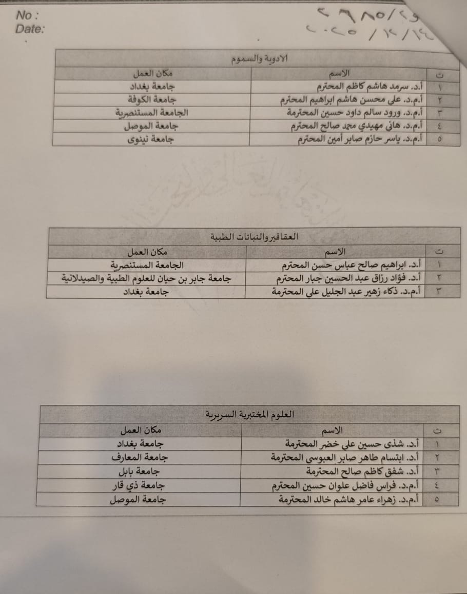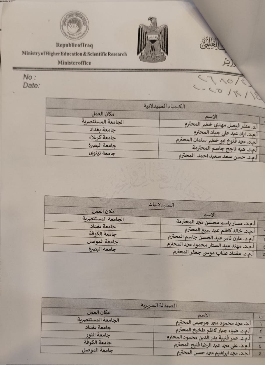 تتقدّم عمادة كلية الصيدلة في جامعة الموصل بأسمى آيات التهاني والتبريكات إلى نخبة من تدريسييها، بمناسبة حصولهم على كتاب شكر وتقدير من معالي وزير التعليم العالي والبحث العلمي الأستاذ الدكتور نعيم العبودي المحترم.
